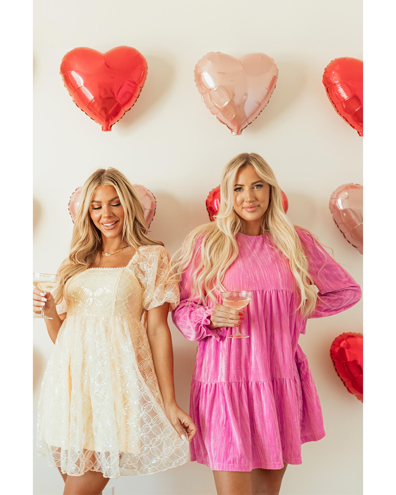 Apricot Sequined Lace Mesh Bubble Sleeve Square Neck Dress – S