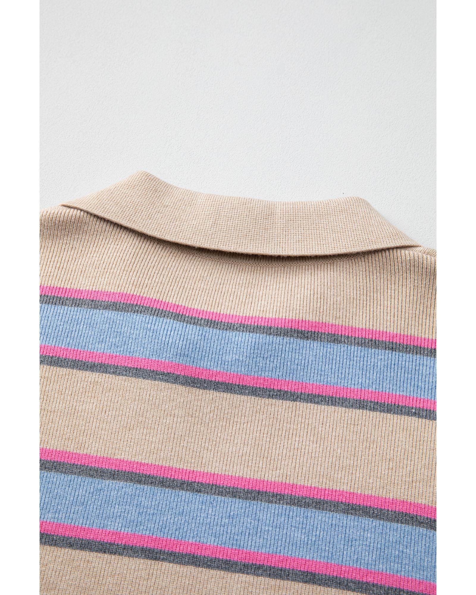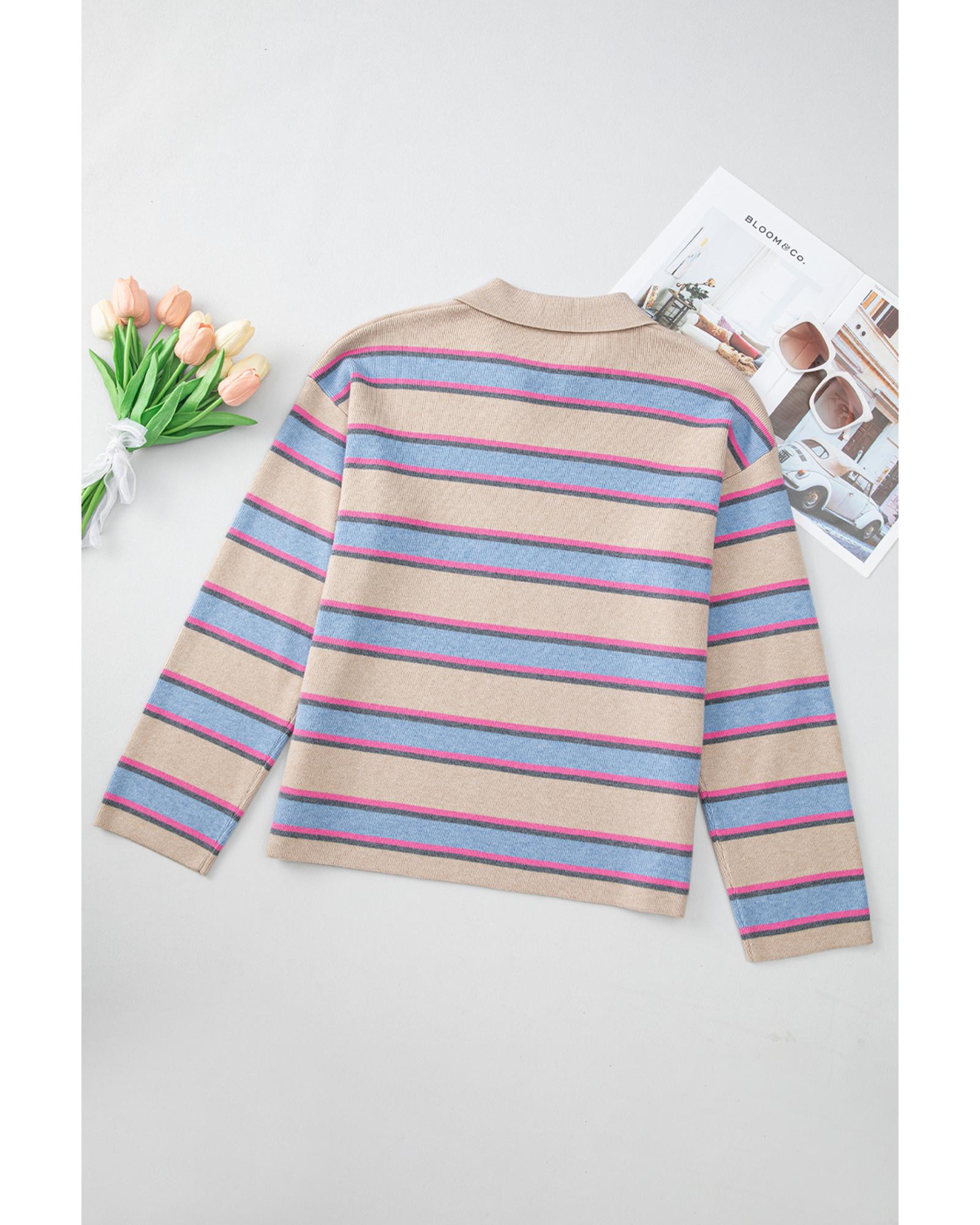 Apricot Stripe Collared V Neck Drop Shoulder Loose Sweater – M