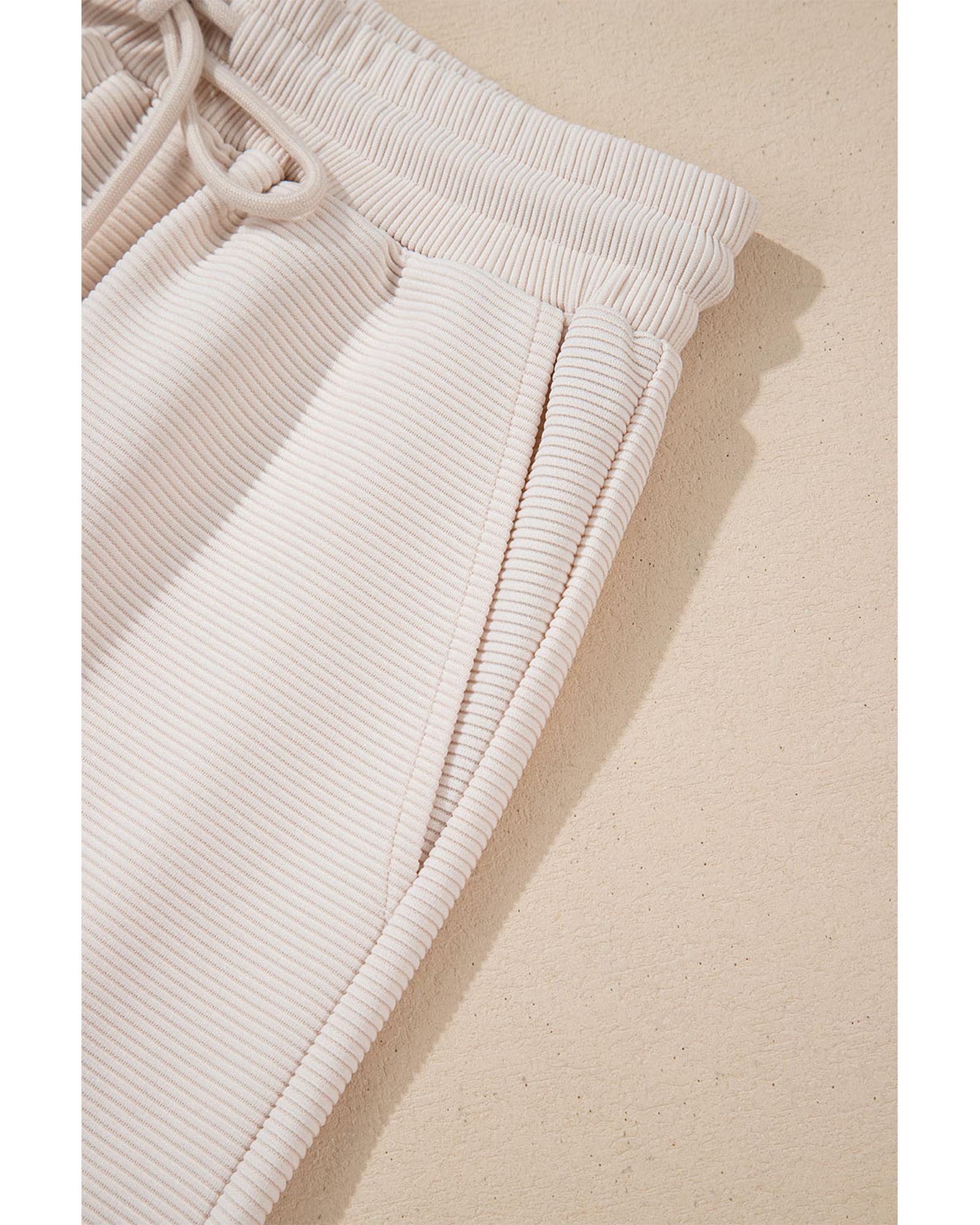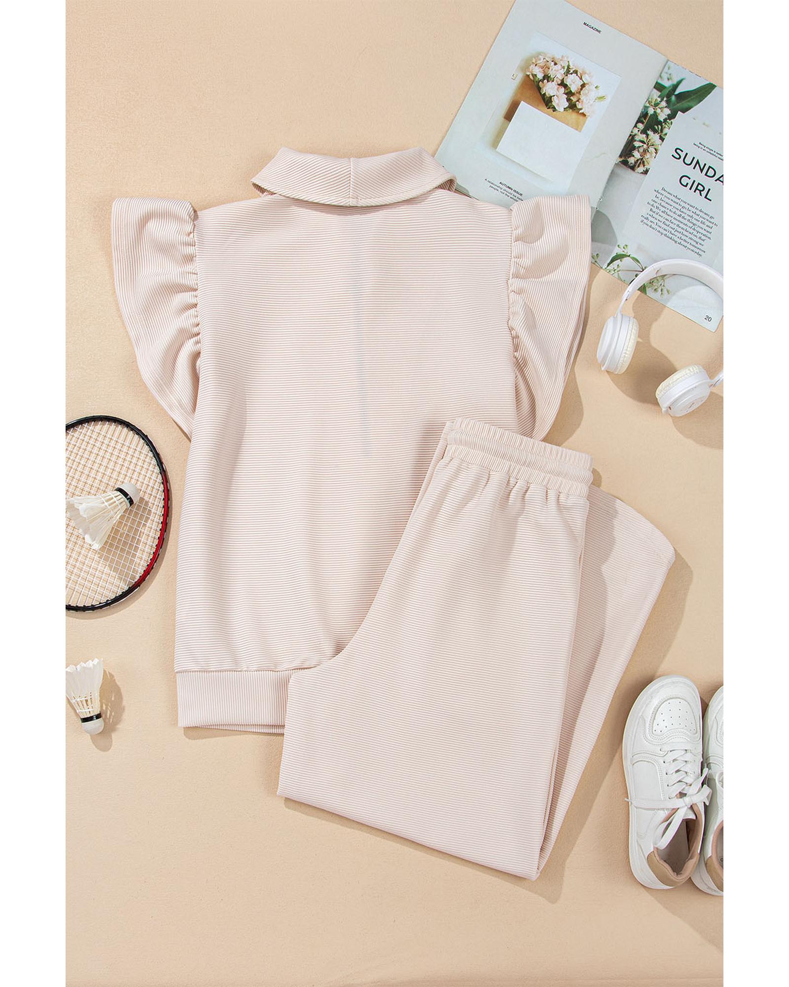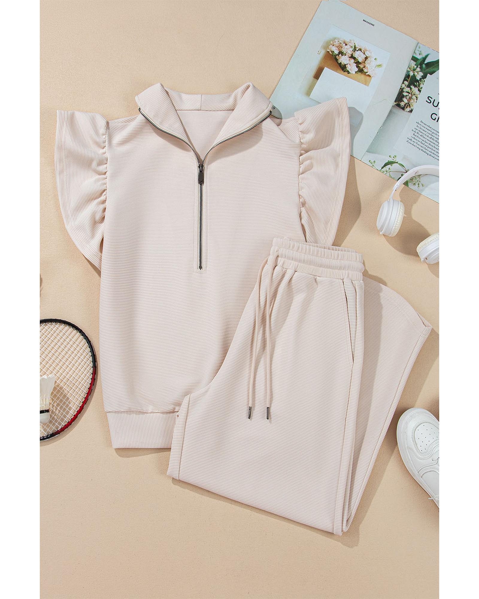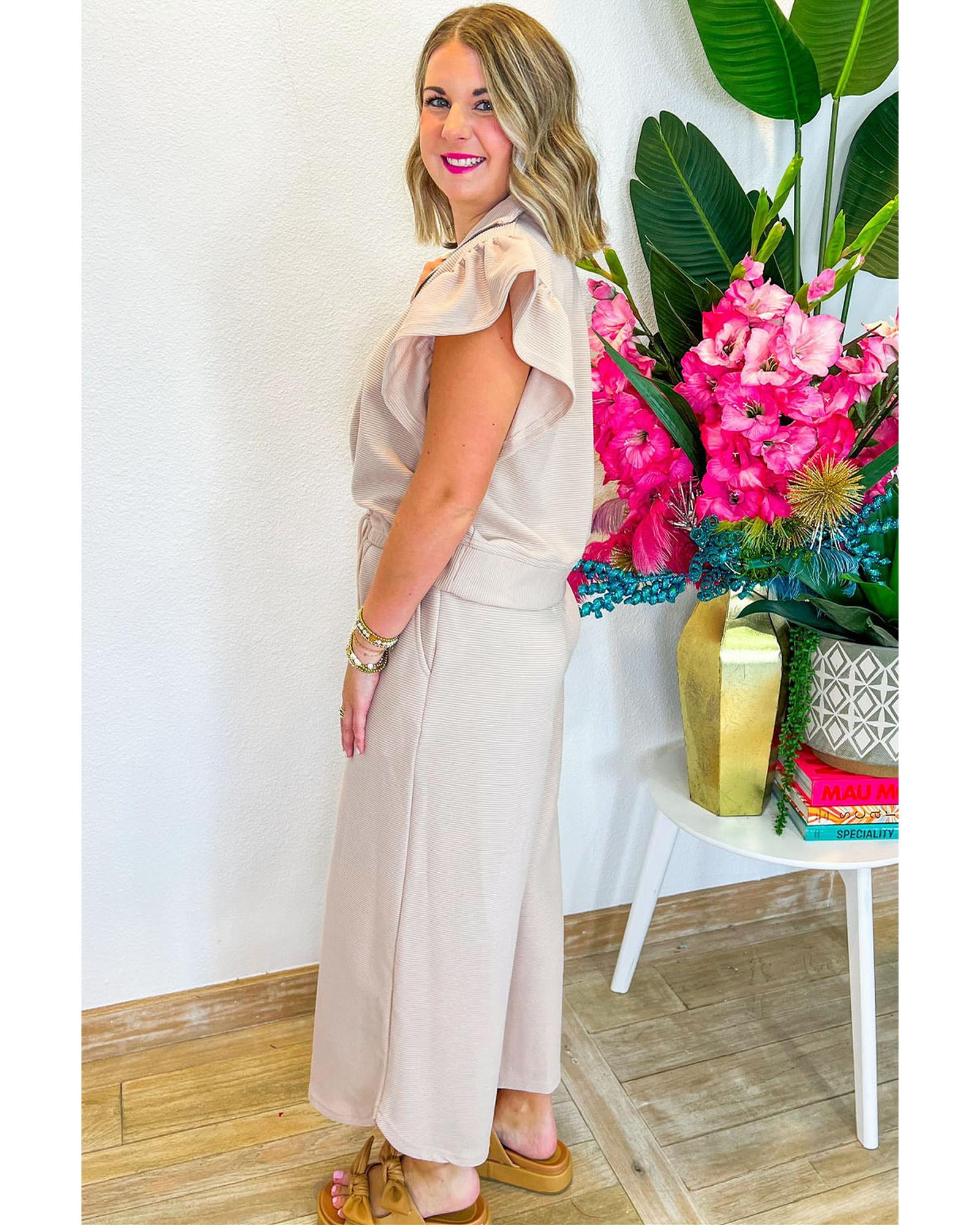 Apricot Textured Ruffled Sleeve Zipped Top and Wide Leg Pants Set – S