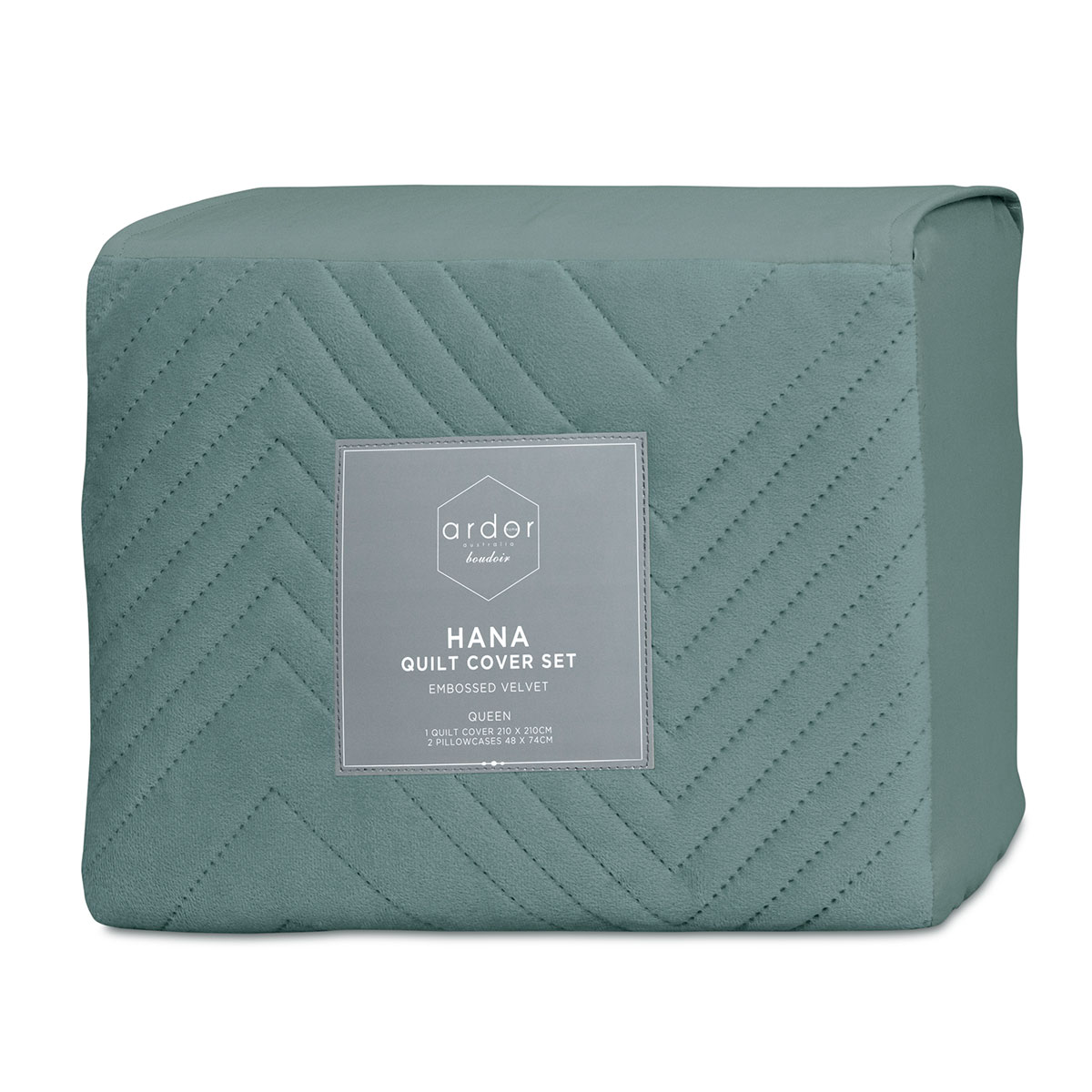 Elevate your bedroom decor to modern sophistication with the Hana Stormy Sea Embossed Velvet Quilted Quilt Cover Set by Ardor. Featuring a luxurious chevron embossed velvet front with a plain dyed reverse. It is made from quality and easy care polyester fabric for long-lasting use.