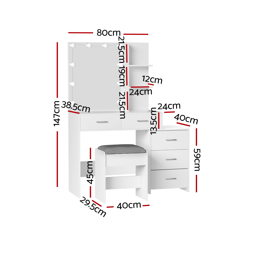 Feel like a star straight out of Hollywood with the Artiss Dale Dressing Table. Packed with generous storage and other convenient features, your new beauty routine will be a breeze. Made from quality particleboard with a white melamine finish, the table is built to last. The Hollywood-style makeup mirror is surrounded by bright LEDs for the perfect illumination. Choose from warm, neutral and daylight white light so you can always look stage-ready. The adjustable side chest features open shelves that you can use to display trinkets or beauty products. Five generous storage drawers give you instant access to your beauty essentials. A foam-padded PU leather stool allows you to sit in comfort while applying make-up or skincare and can be neatly tucked away when not in use. Easy to install and even easier to maintain, you’ll love getting ready for the day in front of your new Artiss Dale Dressing Table.