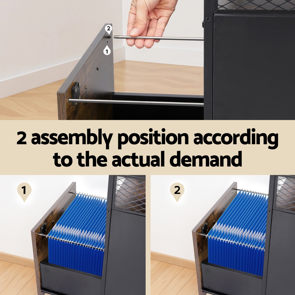 Organise your office with the Artiss Filing Cabinet featuring rustic wood finish and smooth-rolling lockable wheels. This 2-drawer file cabinet offers secure storage with locking mechanism, while the 75kg-capacity top shelf provides extra space. Adjustable hanging folders accommodate various file sizes, and matte black handles add sleek style. Its sturdy steel frame ensures durability for home or office use.