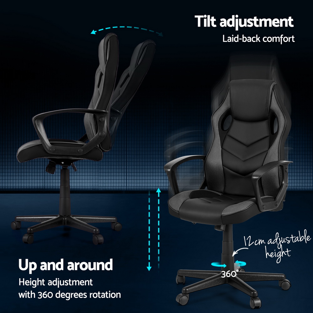 With its distinct and comfortable design, the Artiss Gaming Chair is perfect for the professional gamer or executive. Upholstered in premium PU leather and breathable mesh, the chair seat is richly padded and comfortable thanks to its high-density sponge padding. The plywood frame keeps the chair firm in the right places for adequate support. Taking its design cues from a racing car seat, the high-back body wrap chair also features two holes near the headrest for ample ventilation. Strong PP armrests give you a place to rest your weary arms after long hours of typing, clicking or flipping through documents. The chair features a gas lift for 360-degree rotation and height adjustment, and the stylish nylon base has five castor wheels, ensuring you can cruise anywhere smoothly. Best of all, the chair features tilt adjustment so you can get the perfect angle for working, gaming or napping. Whatever drives you, our gaming chair will give you the utmost comfort and support.