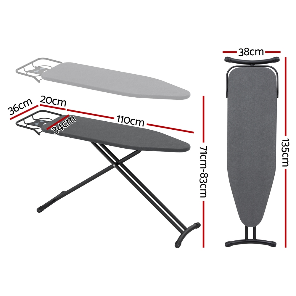 Discover our freestanding Artiss ironing board with a foldaway iron holder for convenience. Folds effortlessly for storage, boasts a robust metal frame, secure locking mechanism, height-adjustable handle, and non-slip legs for stability.