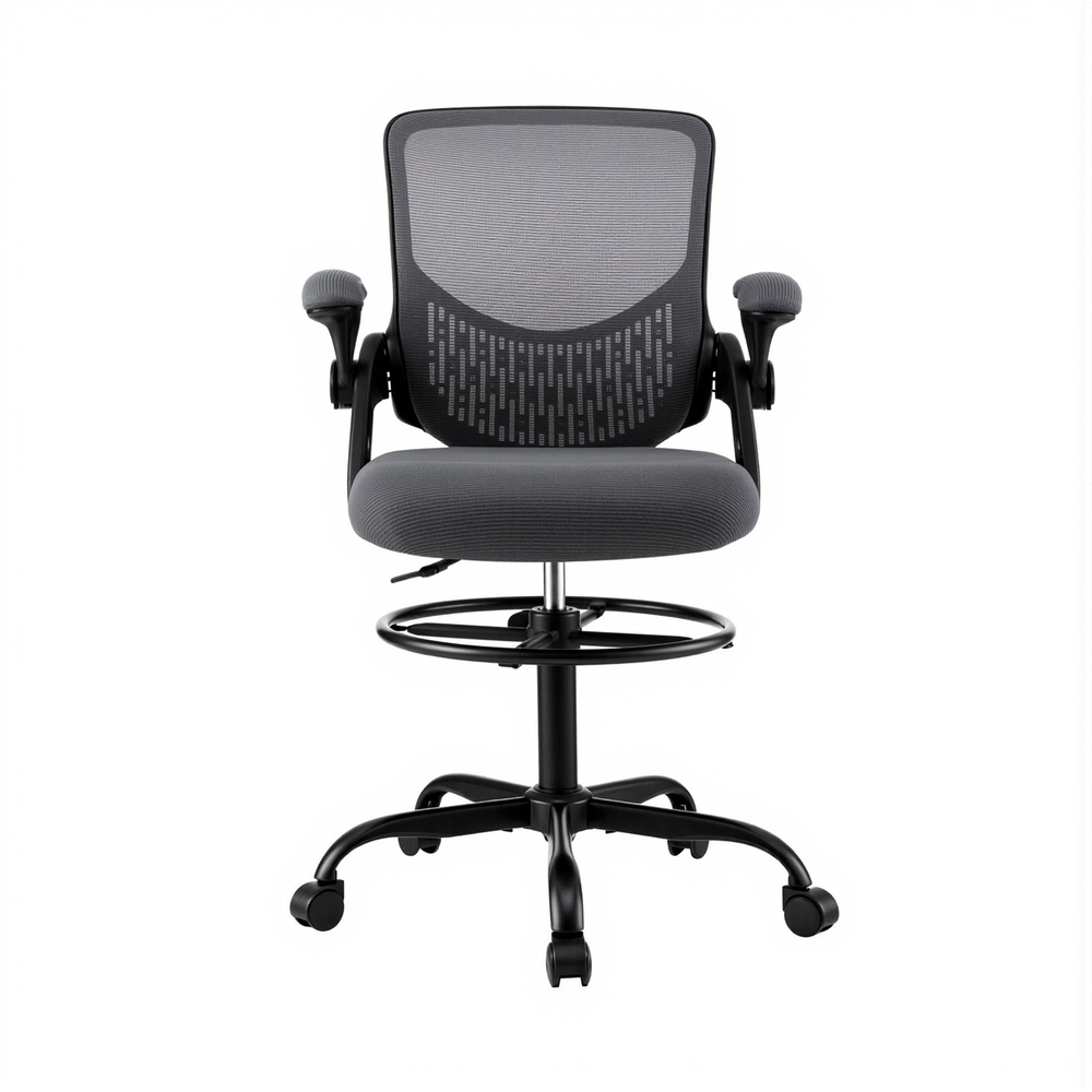 Upgrade your workspace with the Artiss Mesh Drafting Office Chair, designed for both comfort and functionality. The breathable mesh backrest promotes airflow, keeping you cool throughout the day, while its contoured design provides essential support for your back. Flip-up armrests offer flexibility, allowing you to slide the chair under your desk with ease. The height-adjustable seat and footrest ring ensure personalised comfort, making it suitable for various desk heights. With a 360-degree swivel and a stylish chromed base, this chair is both practical and modern—perfect for any home or office setup.
