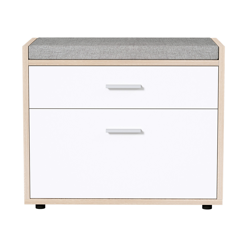 Get yourself a shoe storage cabinet with an aesthetic difference. Our Artiss Shoe Storage Bench blends two functions into one elegant piece. On first impression, it looks just like a plush stool. Pull down the bottom cabinet door and you find two tiers of shelves with ample space for 6 to 8 pairs of various footwear. Plus, the panel in the middle is adjustable or removable for bigger shoes. There is also a spacious top drawer with smooth anti-rust runners for all your other footwear essentials such as shoe polish and spare shoelaces. Made from quality particle board, the bench is sturdy and finished in smooth paper veneer for durability and easy maintenance. Best of all, its thoughtful design means that you can place it in your hallway or entrance for a neat and tidy look that blends seamlessly with your home décor. So remove the clutter and get organised with our shoe storage bench. We are sure it will feet right in with your discerning taste for all things stylish and chic.