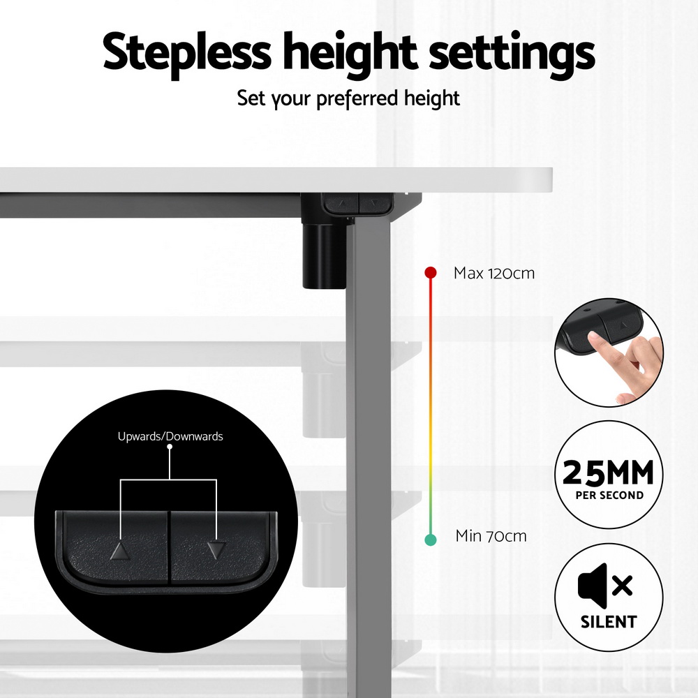 Poor posture and sedentary lifestyles contribute to several health issues. Now keep your health in good shape with the Artiss Motorised Adjustable Desk Frame! Designed to go with our Artiss Desktop, it won't disappoint you either with its quality or aesthetics. With our innovative height-adjustable desk frame, you can stand while working and stretch and engage your muscles to prevent them from weakening. Our desk frame features an easy-to-use digital control panel that enables you to easily adjust the desk to a suitable height and ensure your comfort while working. The smooth motors allow for ultra-quiet operation with low energy consumption. Our high-quality powder-coated desk frame makes cleaning and maintenance easy and ensures ultimate sturdiness. It also comes with adjustable rubber foot pads that offer extra stability and keep your floors safe. As for the desktop, it comes with pre-drilled holes for easy installation. It is made from eco-friendly particleboard and comes with a natural wood grain or contemporary matte finish to create a smooth surface and a beautiful aesthetic. The desktop is scratch resistant and perfect for all your working needs. Get yourself Artiss Motorised Adjustable Desk Frame and Desktop to prevent fatigue and improve productivity.