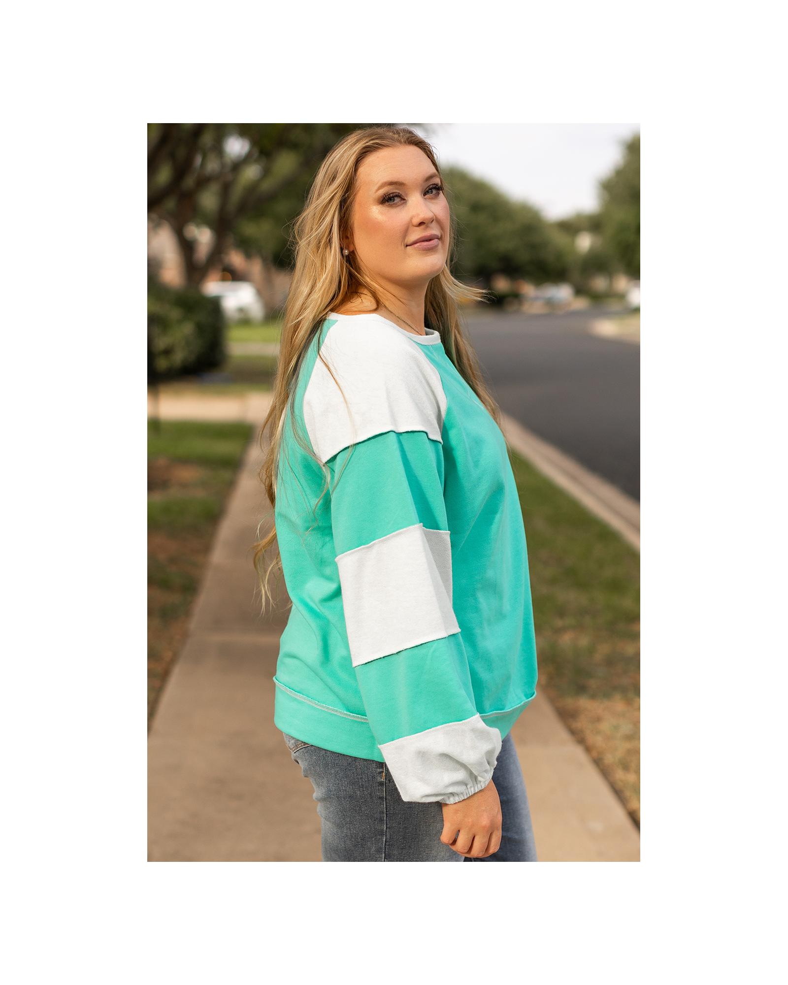 Aruba Blue Colorblock Patchwork Cross Seam Plus Sweatshirt – 1X