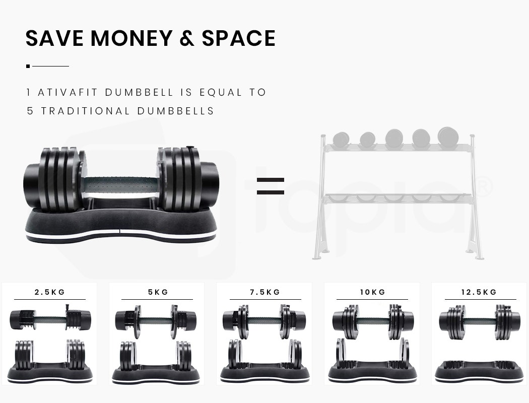 Giving you the versatility of 5 sets of standard dumbbells, your Ativafit set saves you on the initial outlay cost as well as being much more compact to store! With superior design and build quality, it should come as no surprise that Ativafit are leaders in the U.S. market. While other adjustable dumbbell models have a plastic locking system Ativafit utilises a secure high-tensile steel design