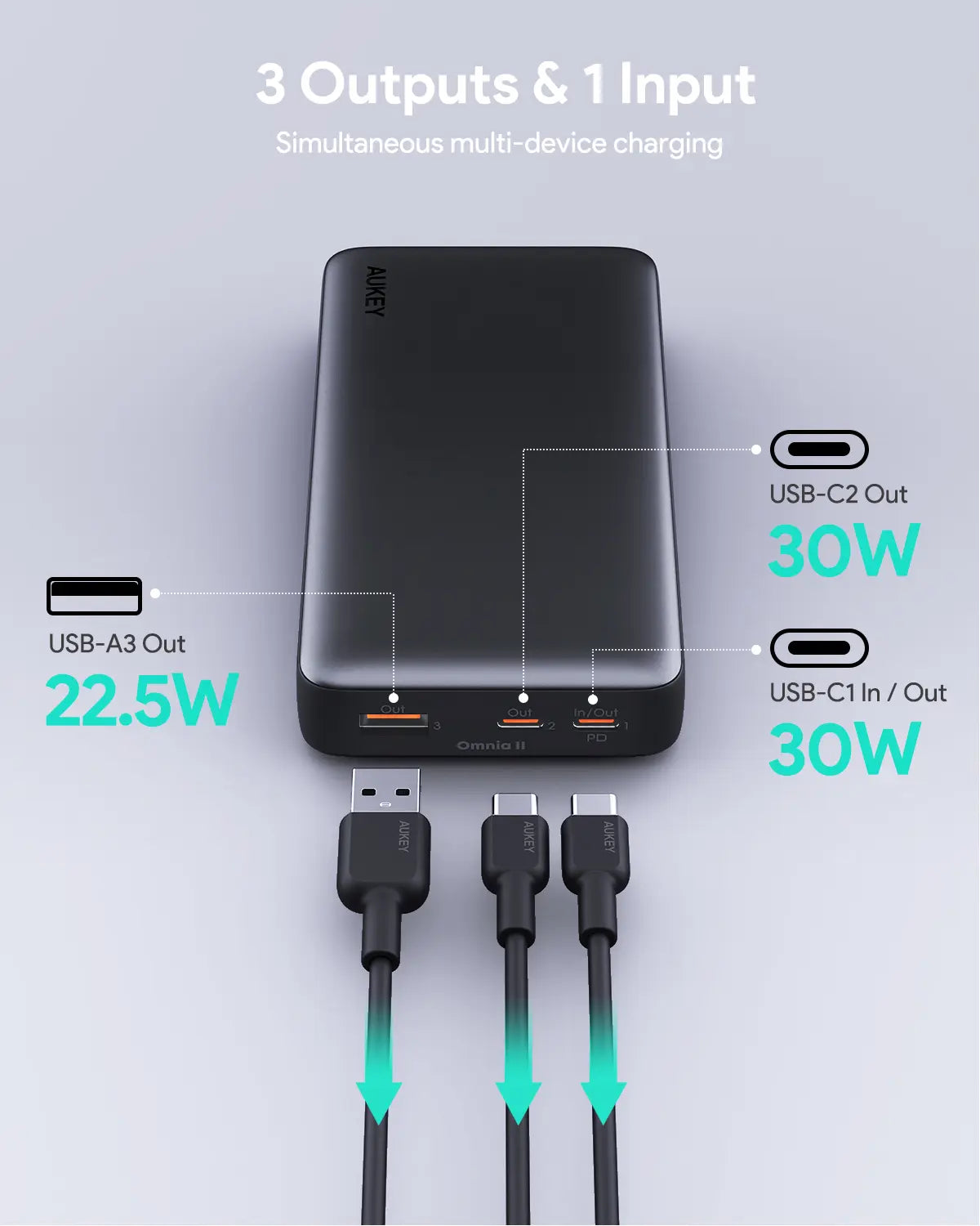 The Aukey 3-Port 30W 20000mAh Power Bank (PB-Y42) is designed to keep your devices powered up anytime, anywhere. With its robust capacity and multiple fast-charging ports, it’s an essential companion for travelers and power users alike.