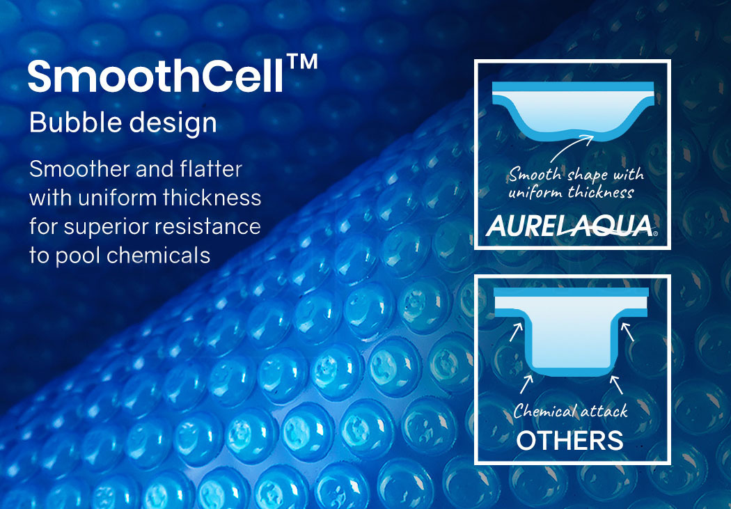 The exclusive Aurelaqua Solar Swimming Pool Cover features an exclusive bubble design with a smooth and flat shape without any sharp curves that are prone to being thin weak points. These thinner sections in other pool blankets are more susceptible to damage by pool chemicals and general wear and tear.