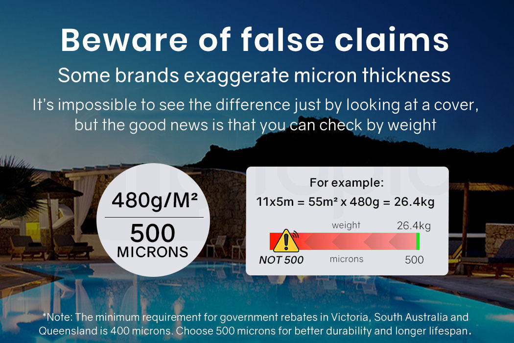 This premium blanket has ultimate durability because of its ability to withstand UV damage, chemical penetration and tearing. While other brands may claim to have a thickness of 500 Microns, we strongly recommend that you check that the weight of their product matches ours. If it doesn’t weigh as much, or if they don’t advertise the product weight, then you should be wary of their claim.
