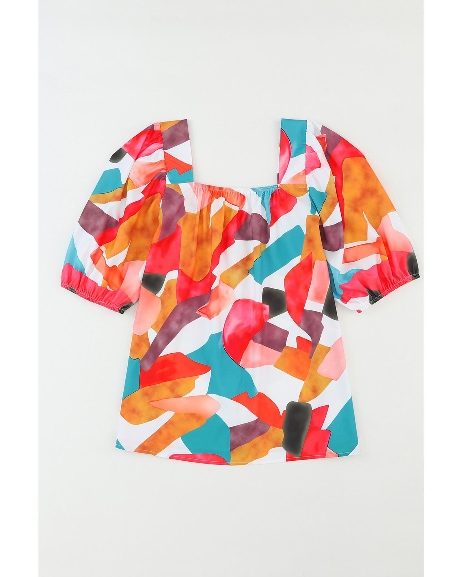 - Multicolor Square Neck Abstract Print Short Sleeve Blouse