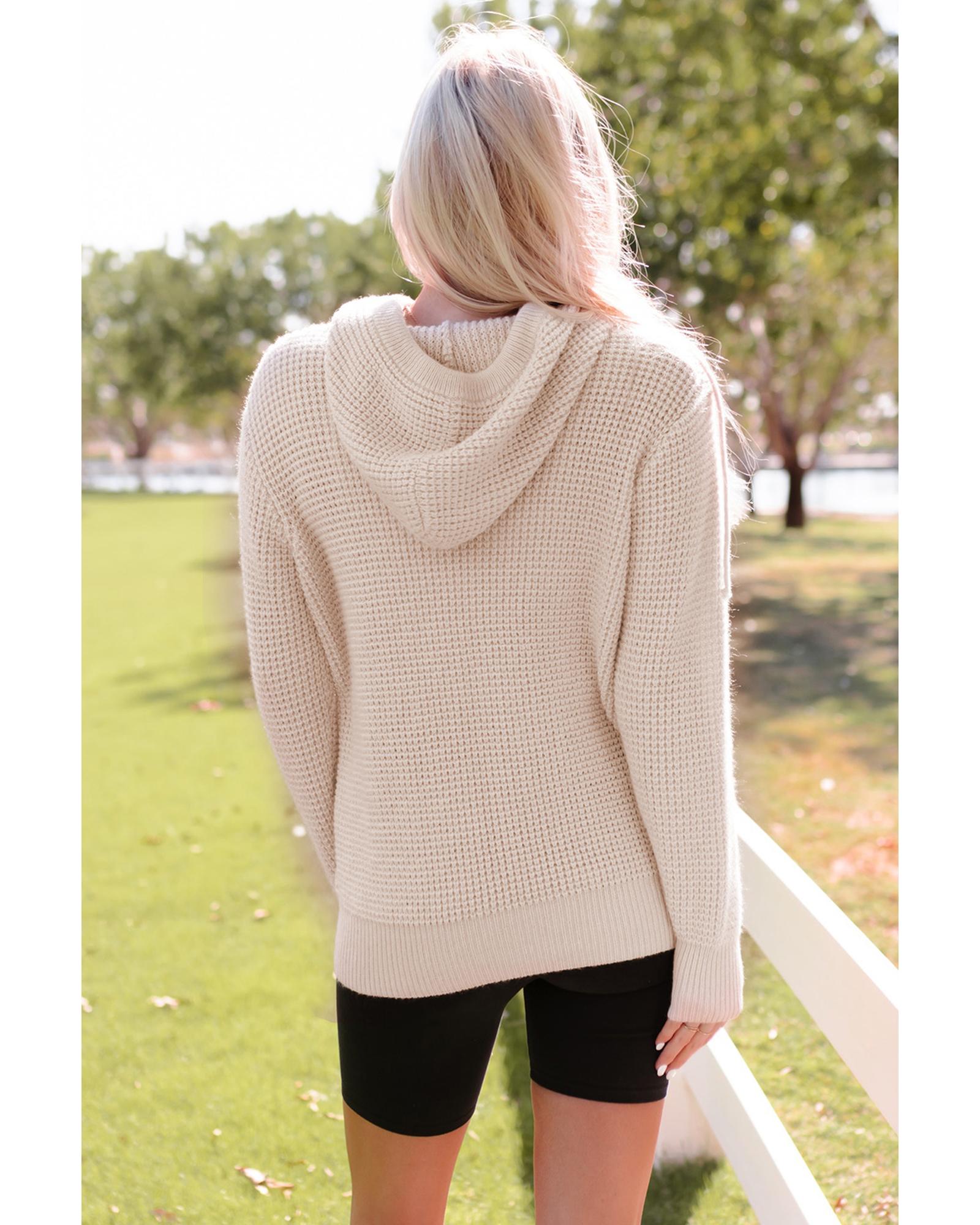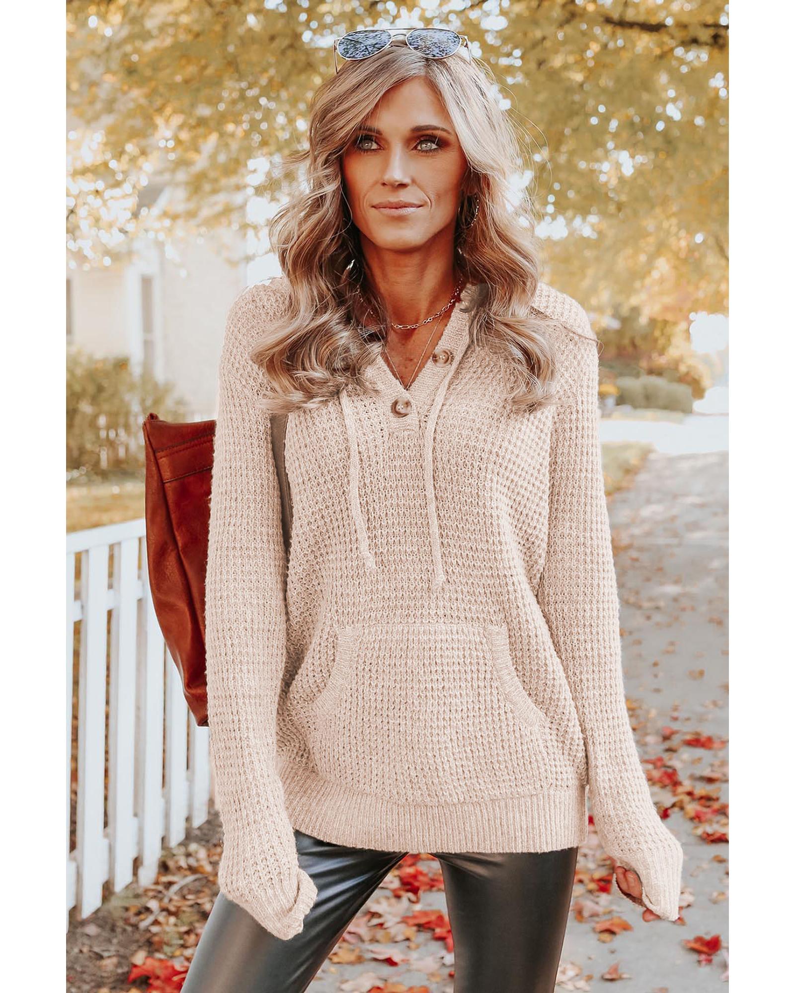 Azura Exchange Apricot Waffle Knit Buttons Hooded Sweater with Pocket – M