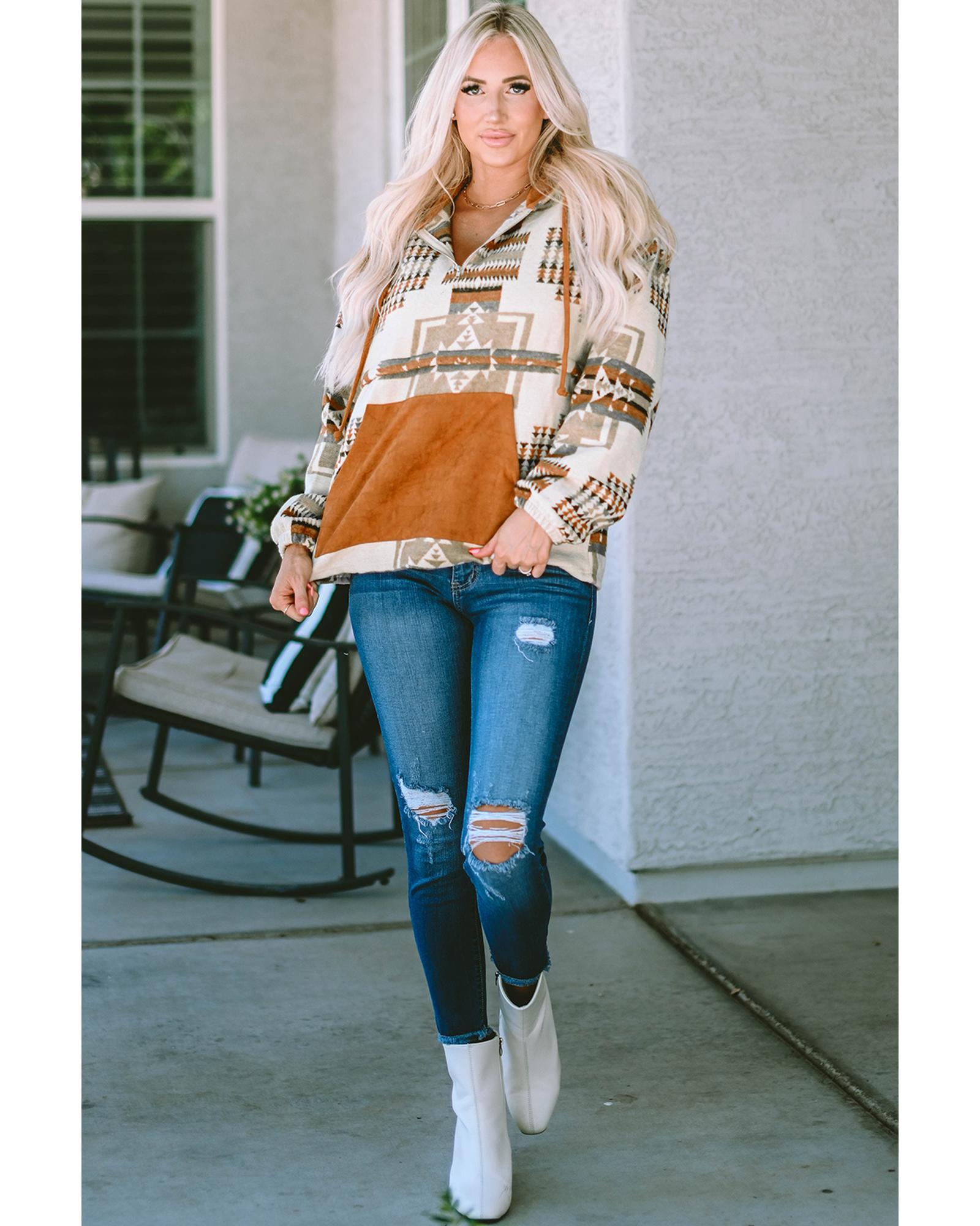 - Beige Aztec Print Kangaroo Pocket Half-Zip Hoodie