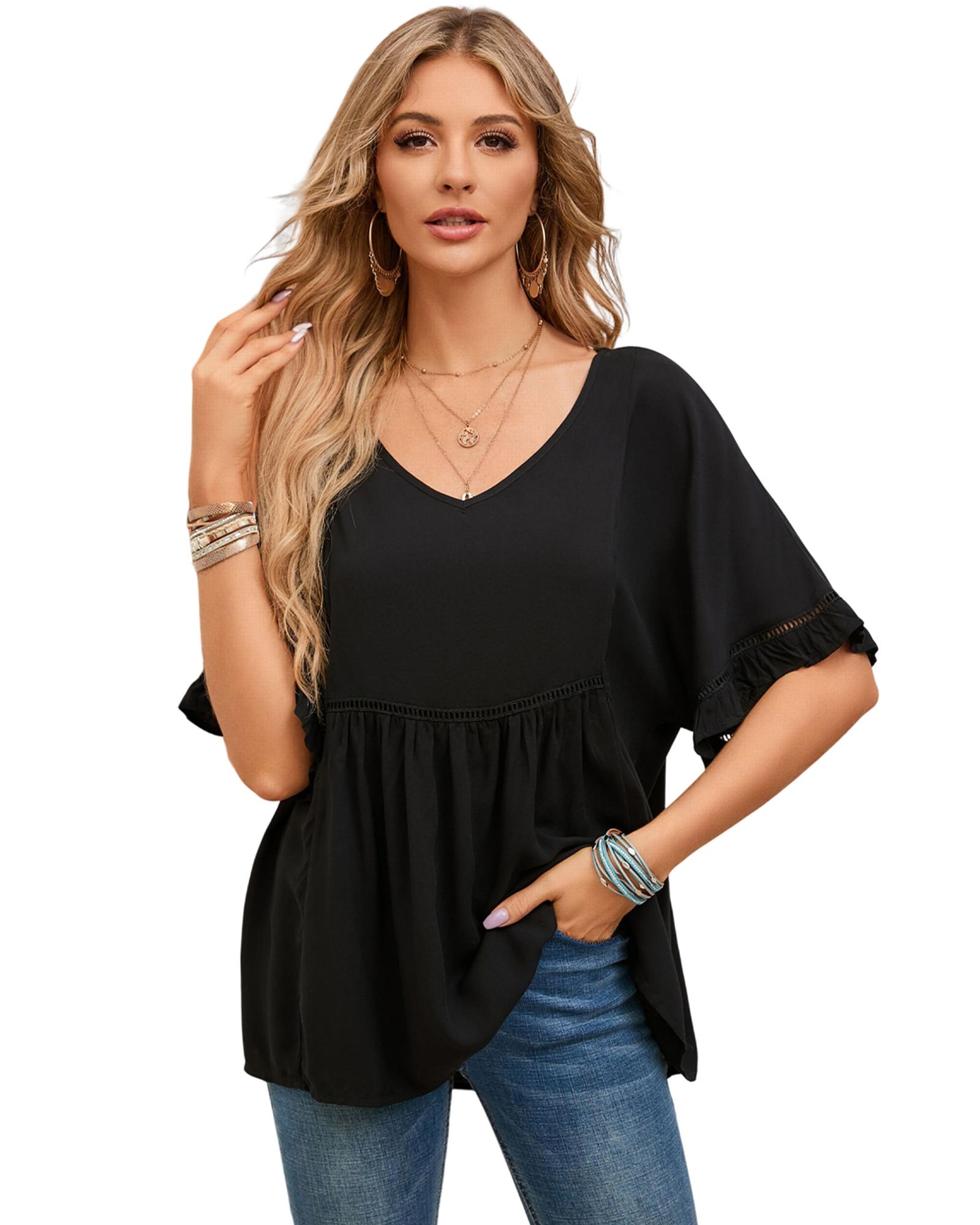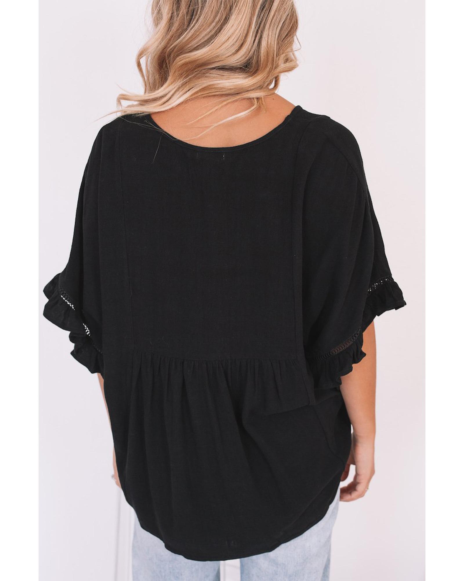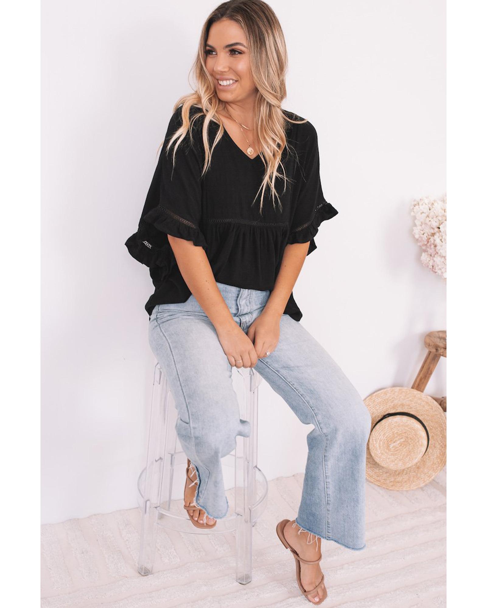 Azura Exchange Black Ruffled Lace Detail Loose V Neck Top – S