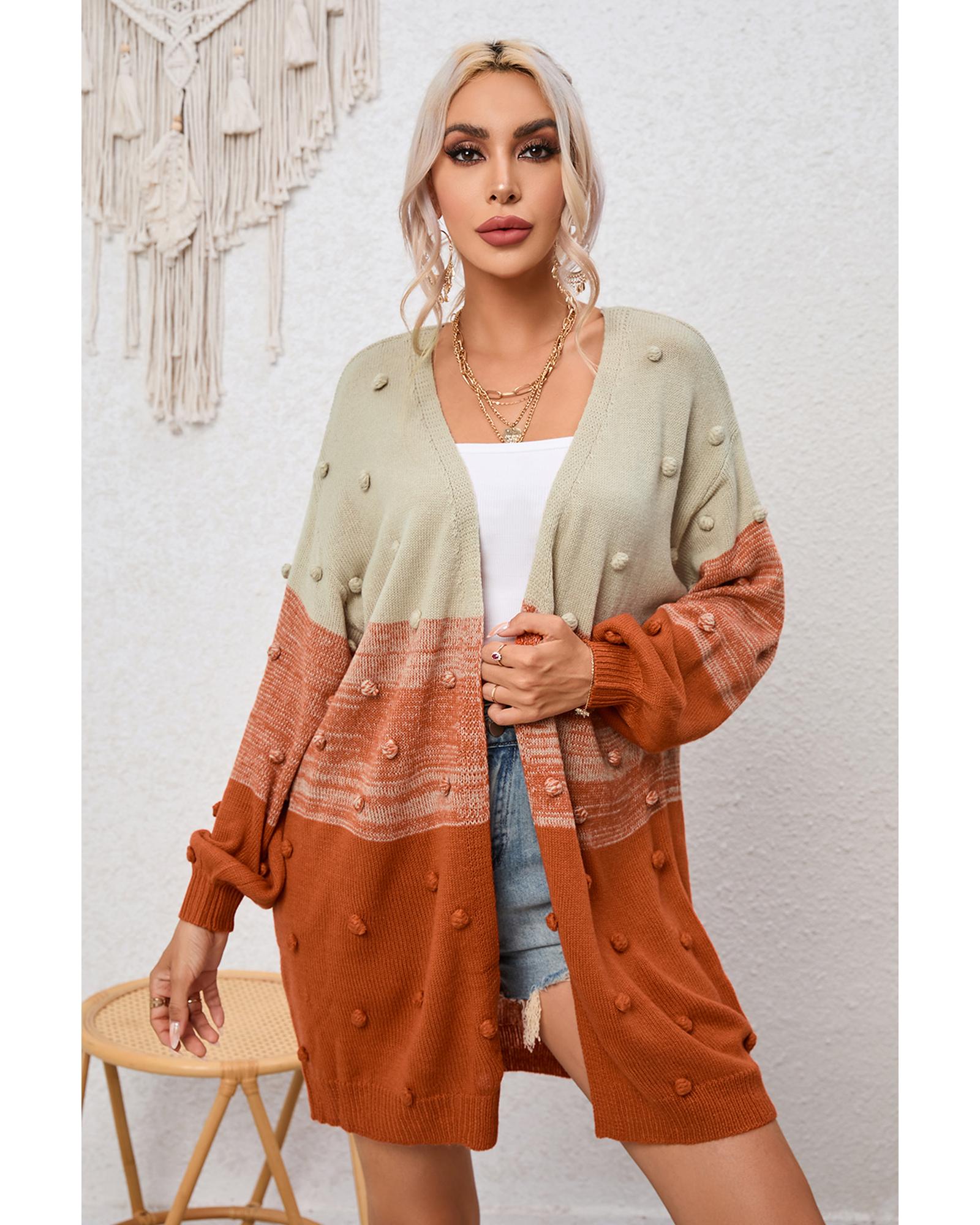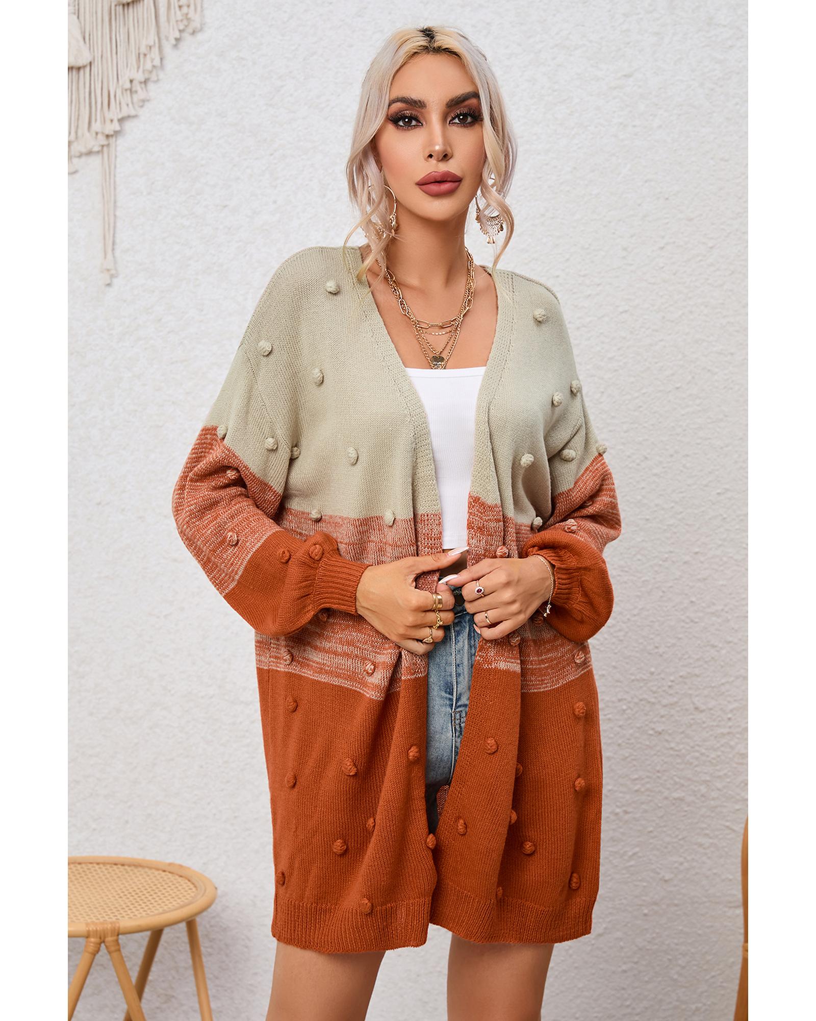Azura Exchange Brown Pompom Color Block Open Front Cardigan – M
