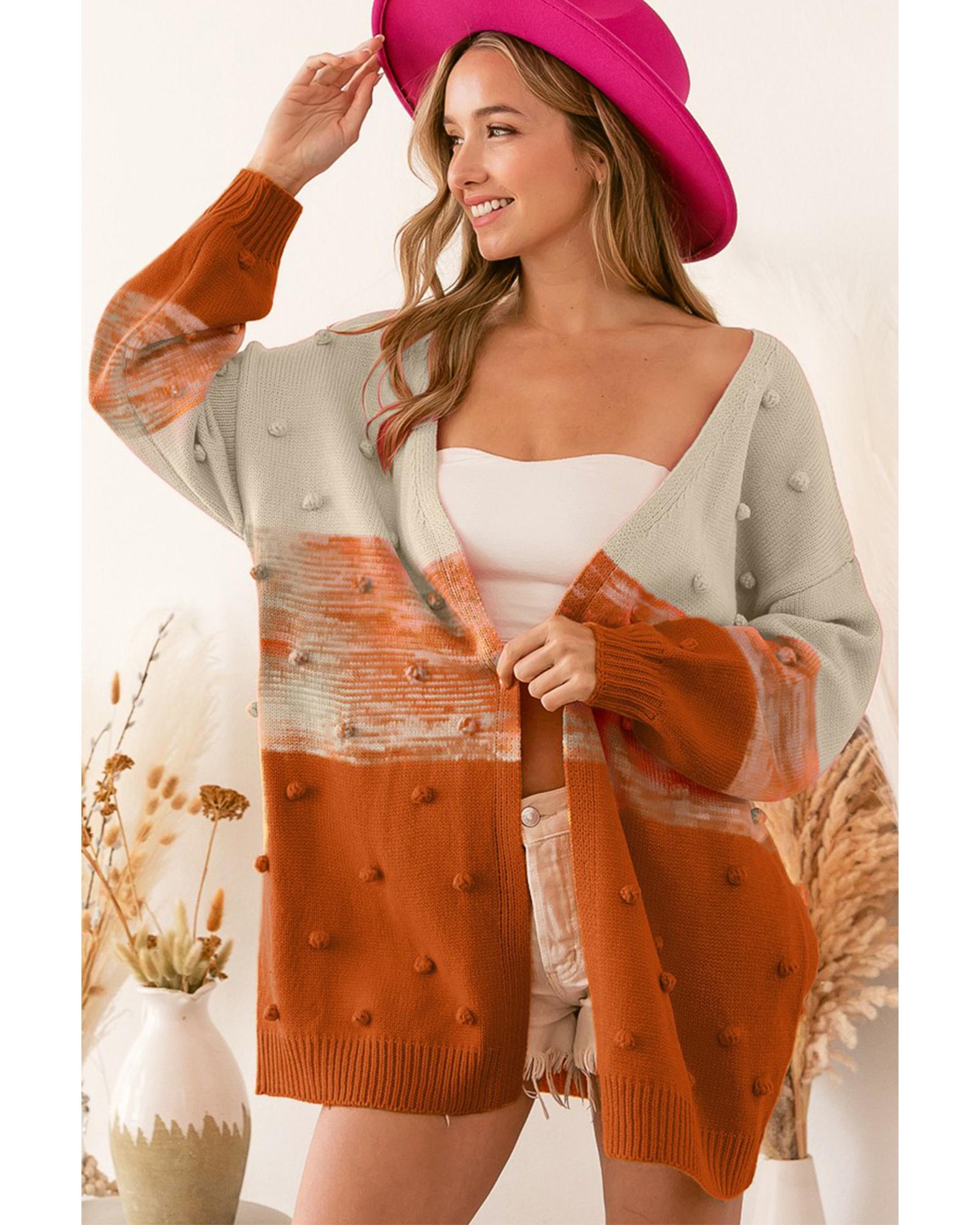 Azura Exchange Brown Pompom Color Block Open Front Cardigan – S