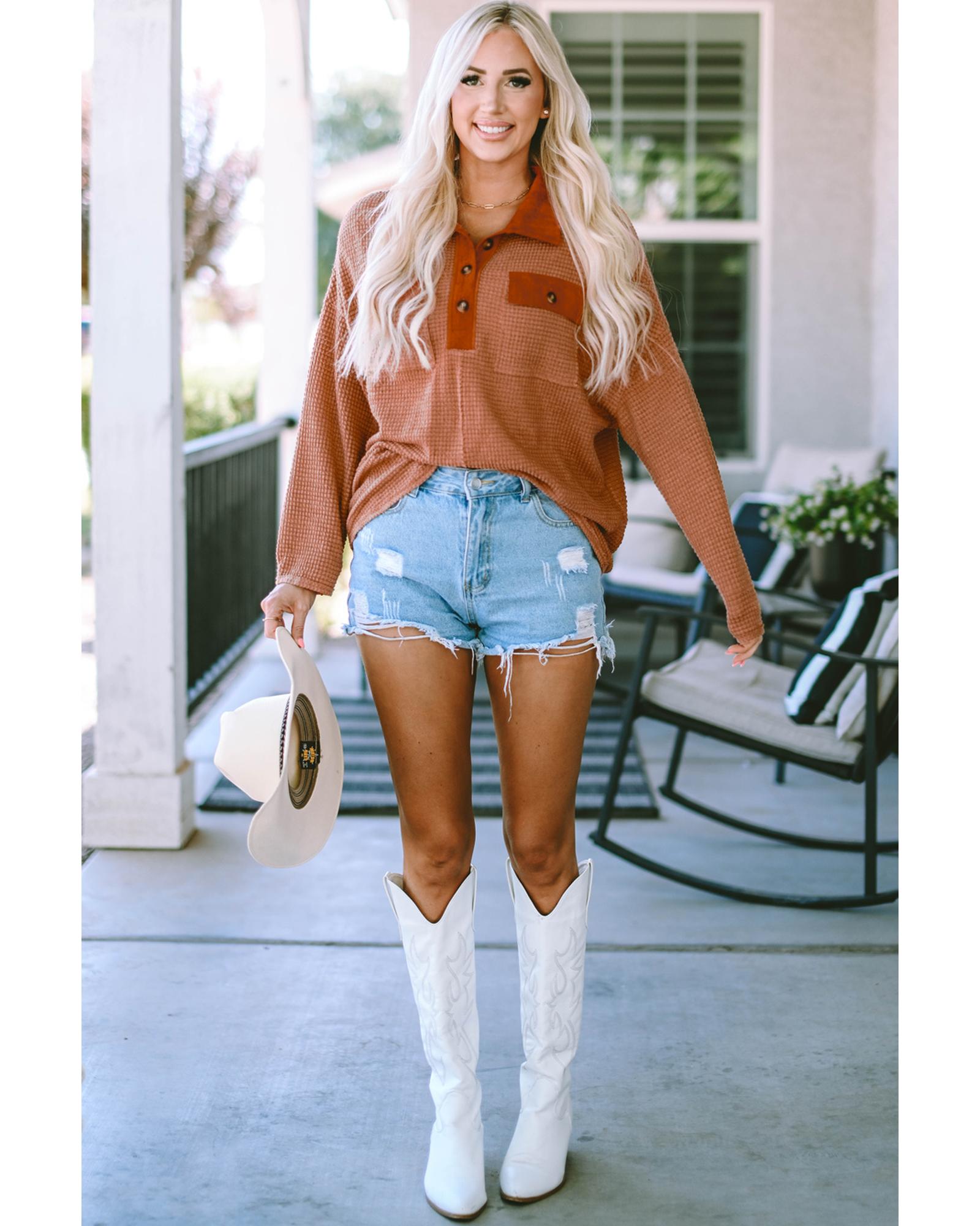 Azura Exchange Button Contrast Trim Waffle Knit Top – M