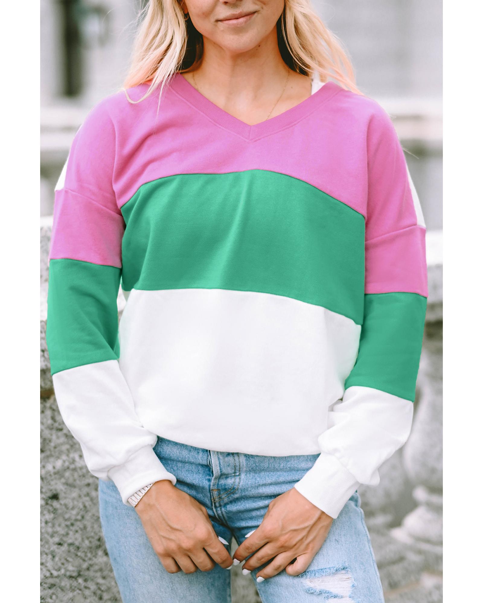 - Ribbed V Neck Color Block Patchwork Sweatshirt