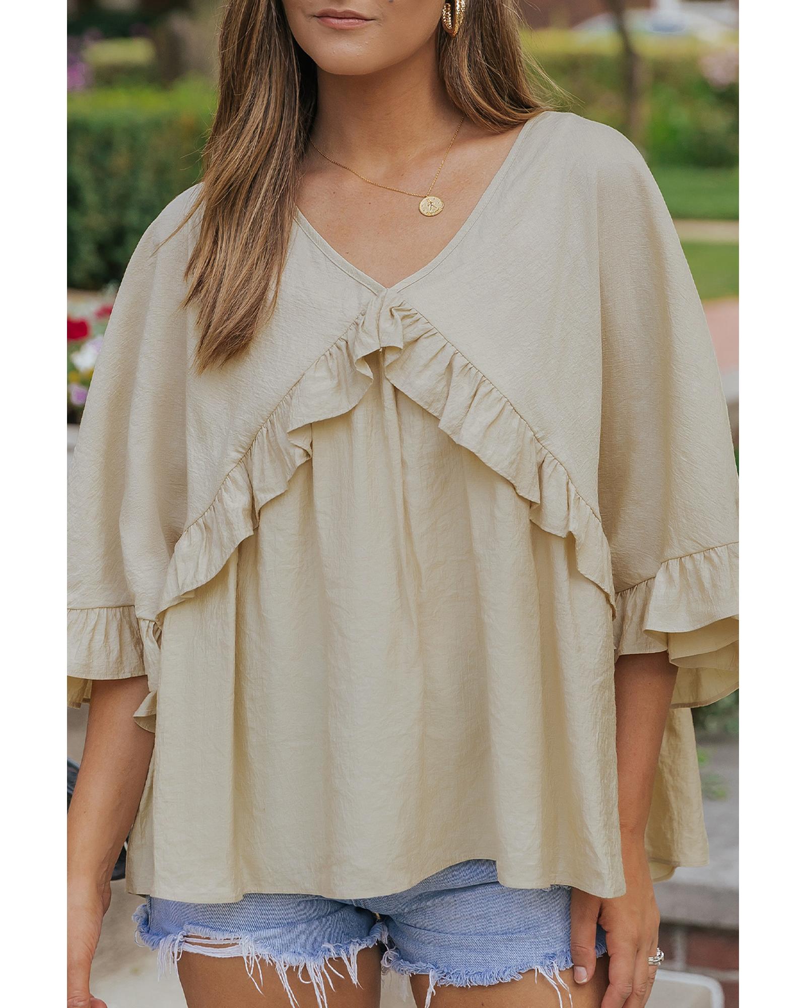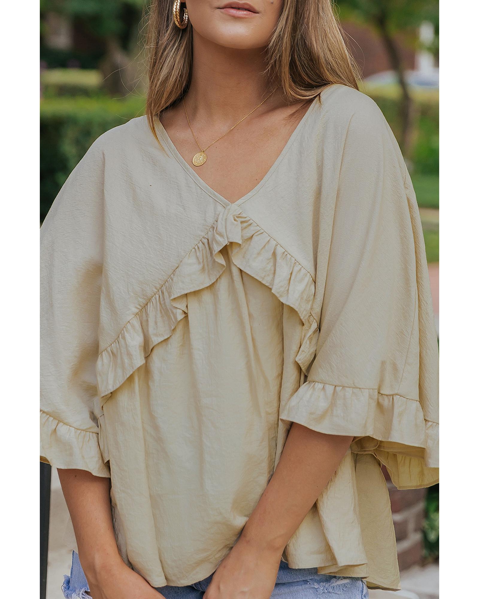 • Stylish and elegant V Neck Draped Batwing Sleeve Ruffle Top
