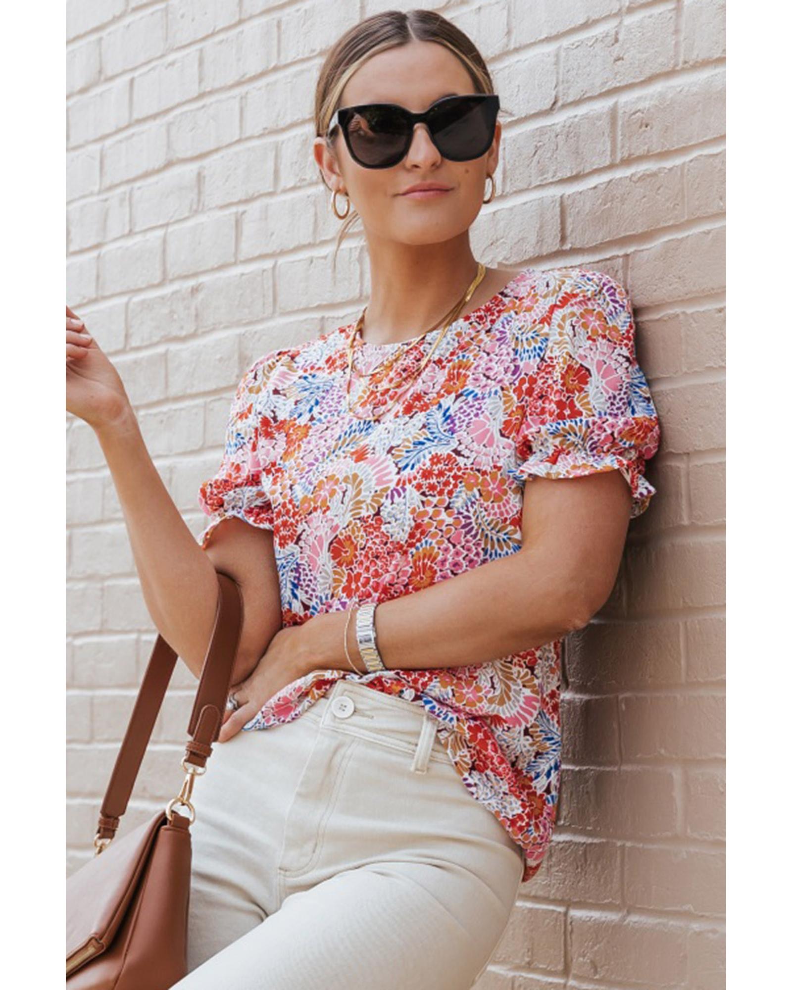 - Multicolor Mix Floral Pattern Bubble Sleeve Blouse