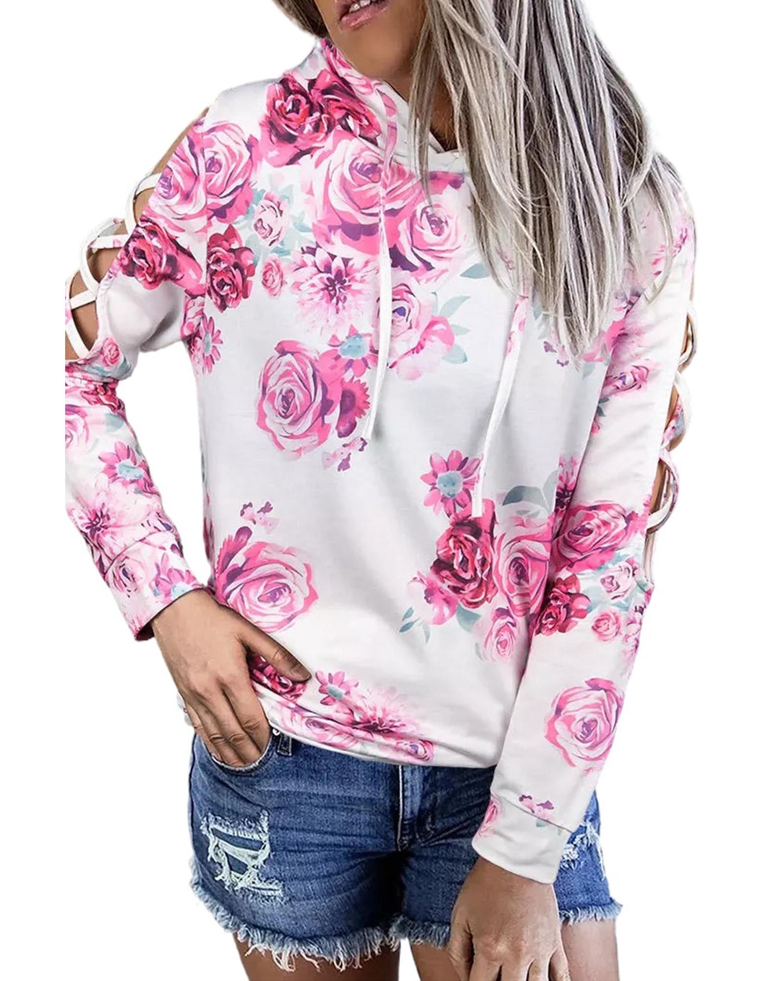 - Womens Floral Print Criss-Cross Cold Shoulder Hoodie