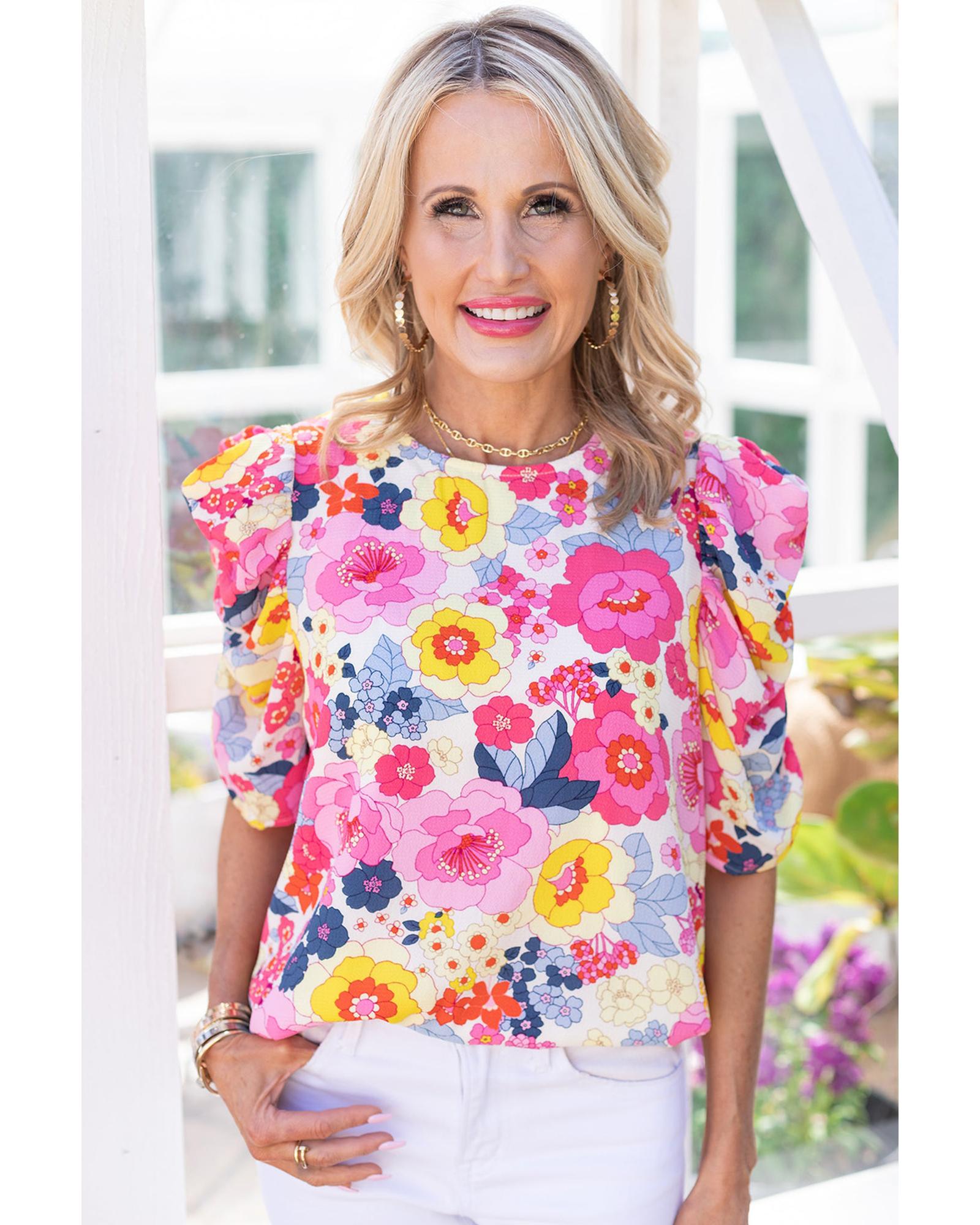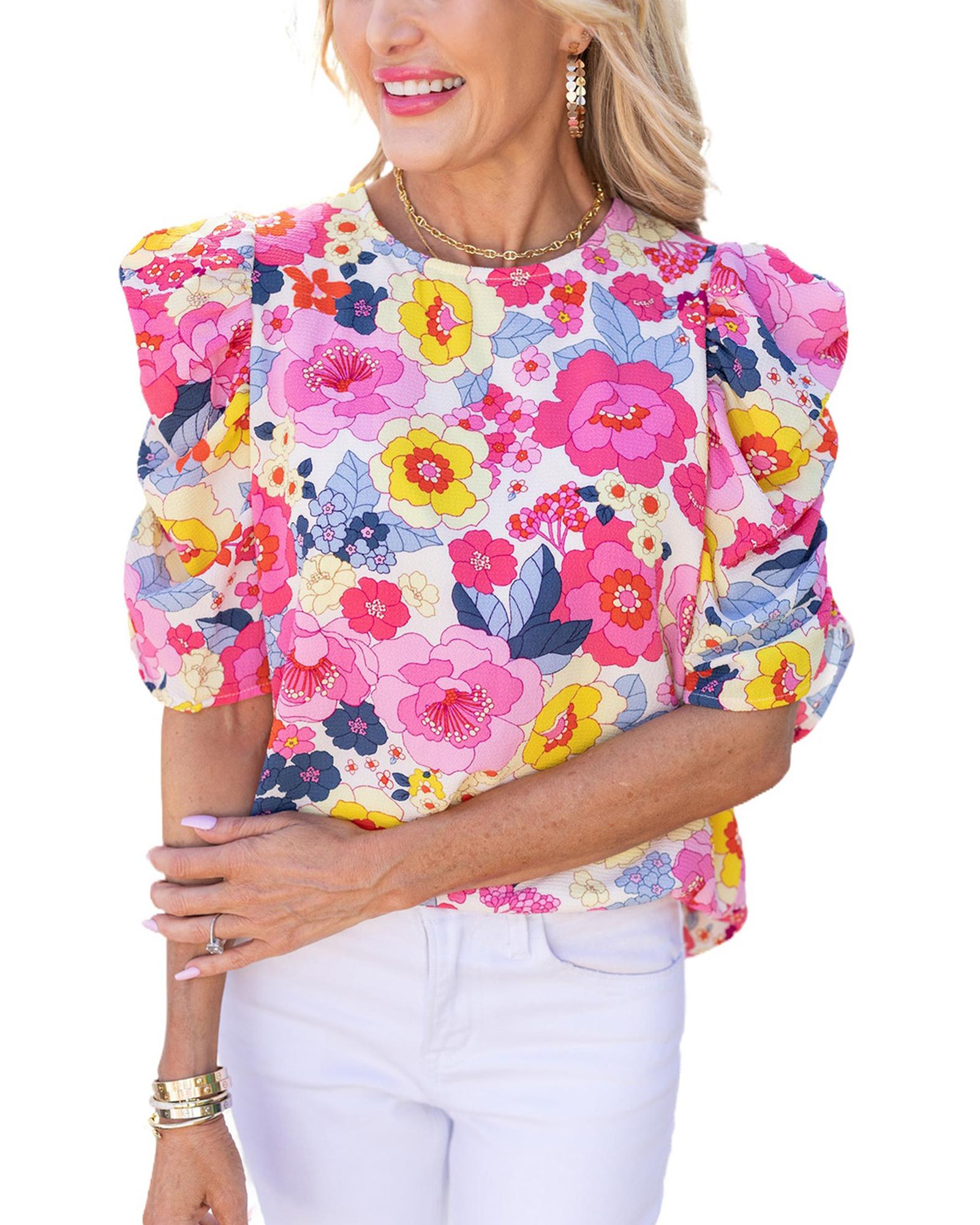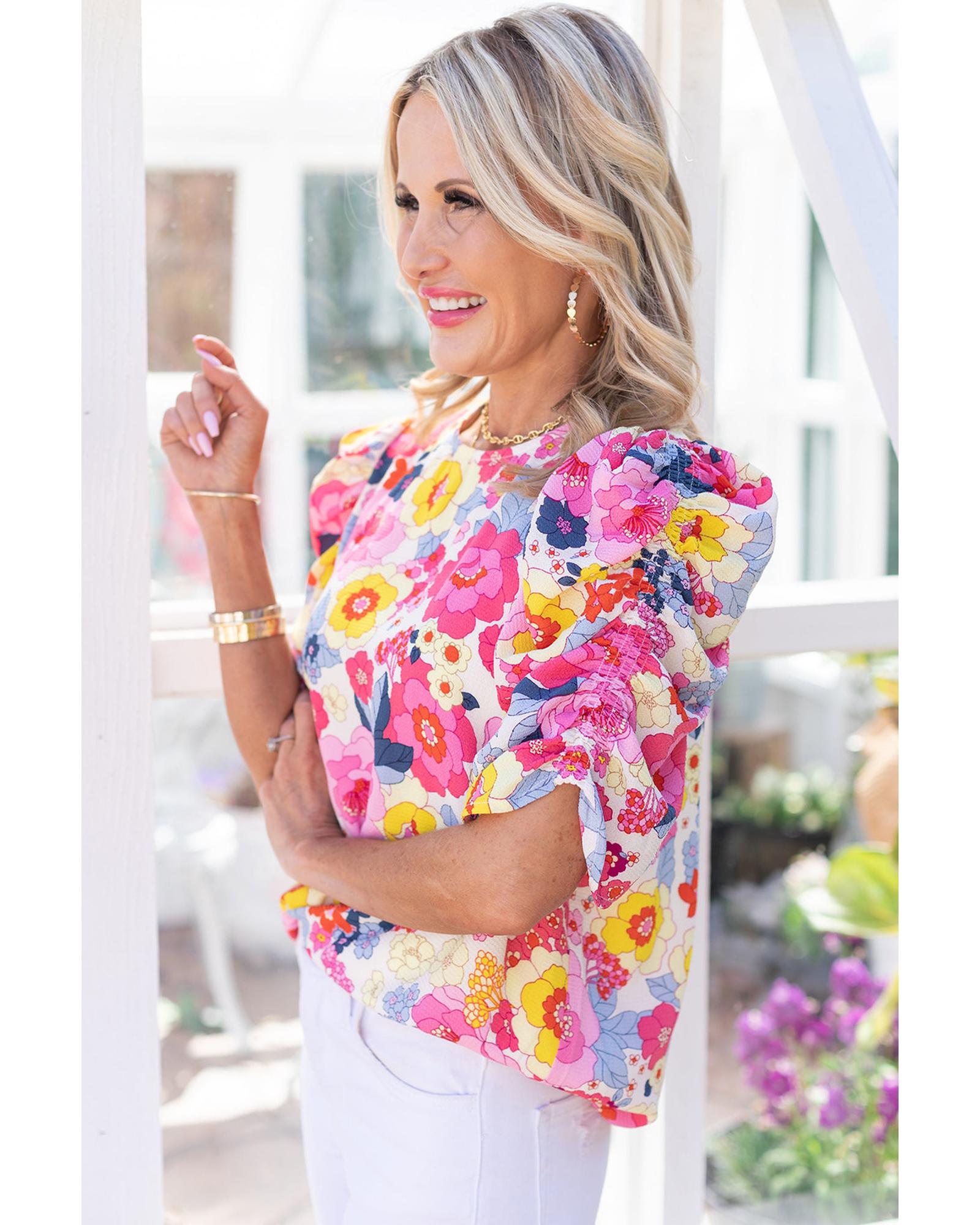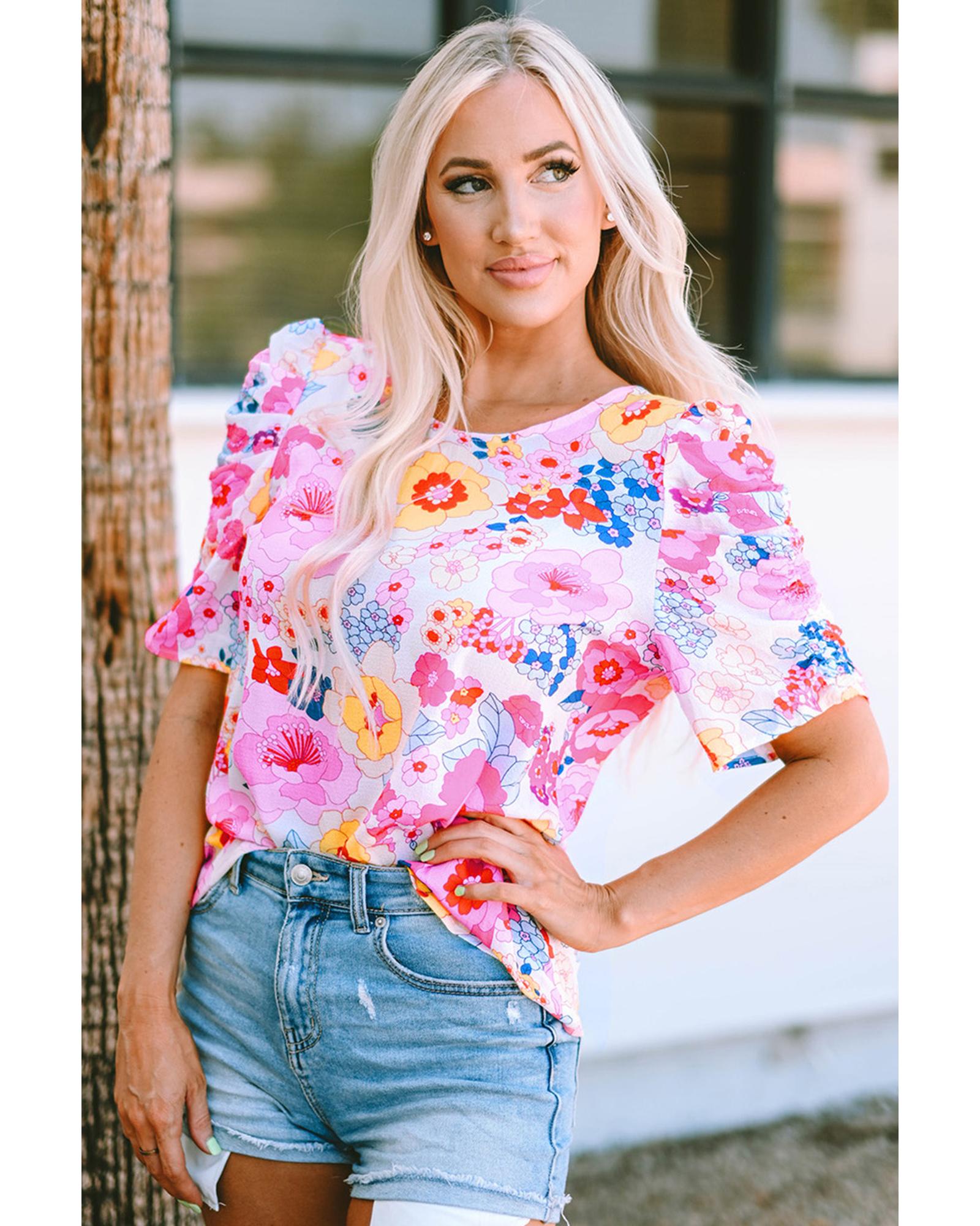 - Luxurious Ruched Puff Sleeve Floral Blouse