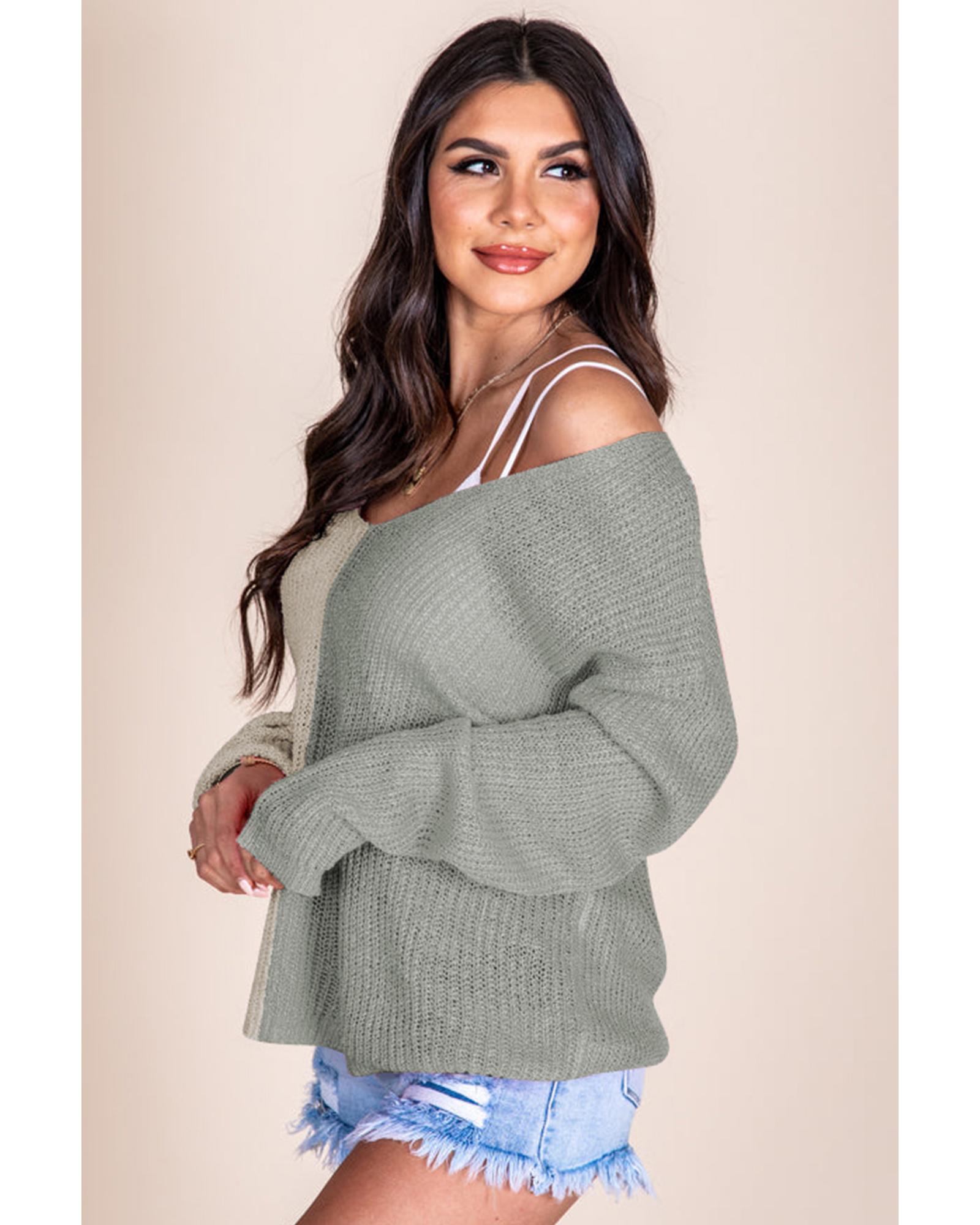 Azura Exchange Gray Long Sleeve V-Neck Colorblock Sweater – L
