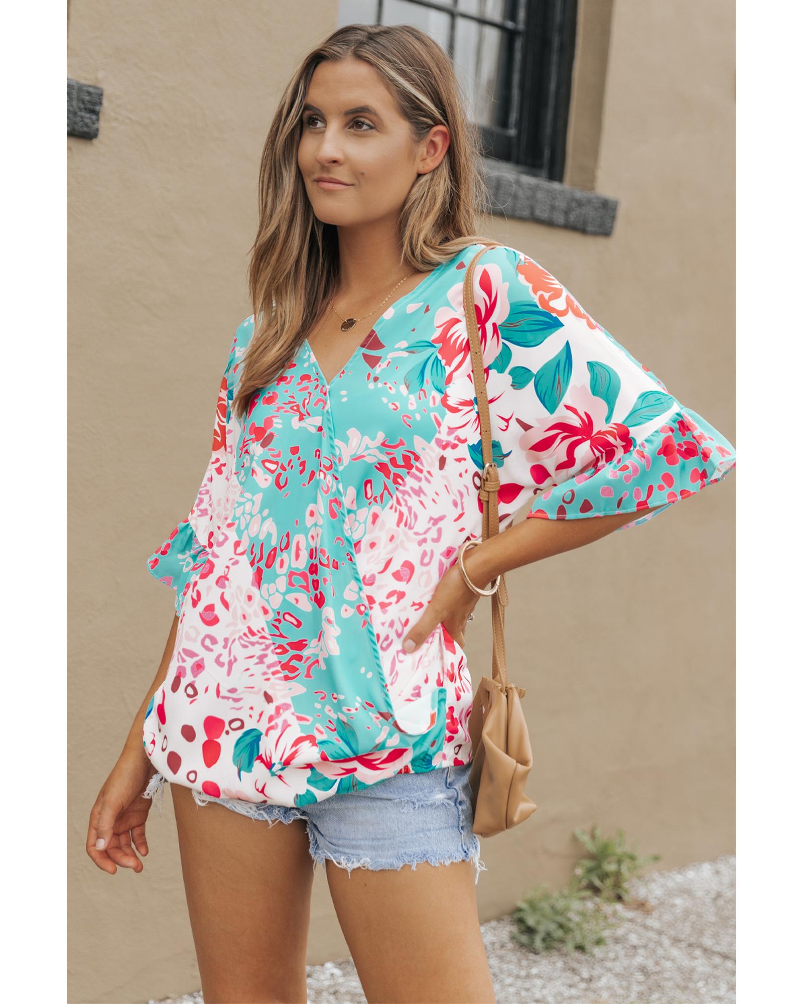 - Trendy and stylish Multicolor Leopard Floral Mixed Print Ruffle Sleeve Surplice Blouse