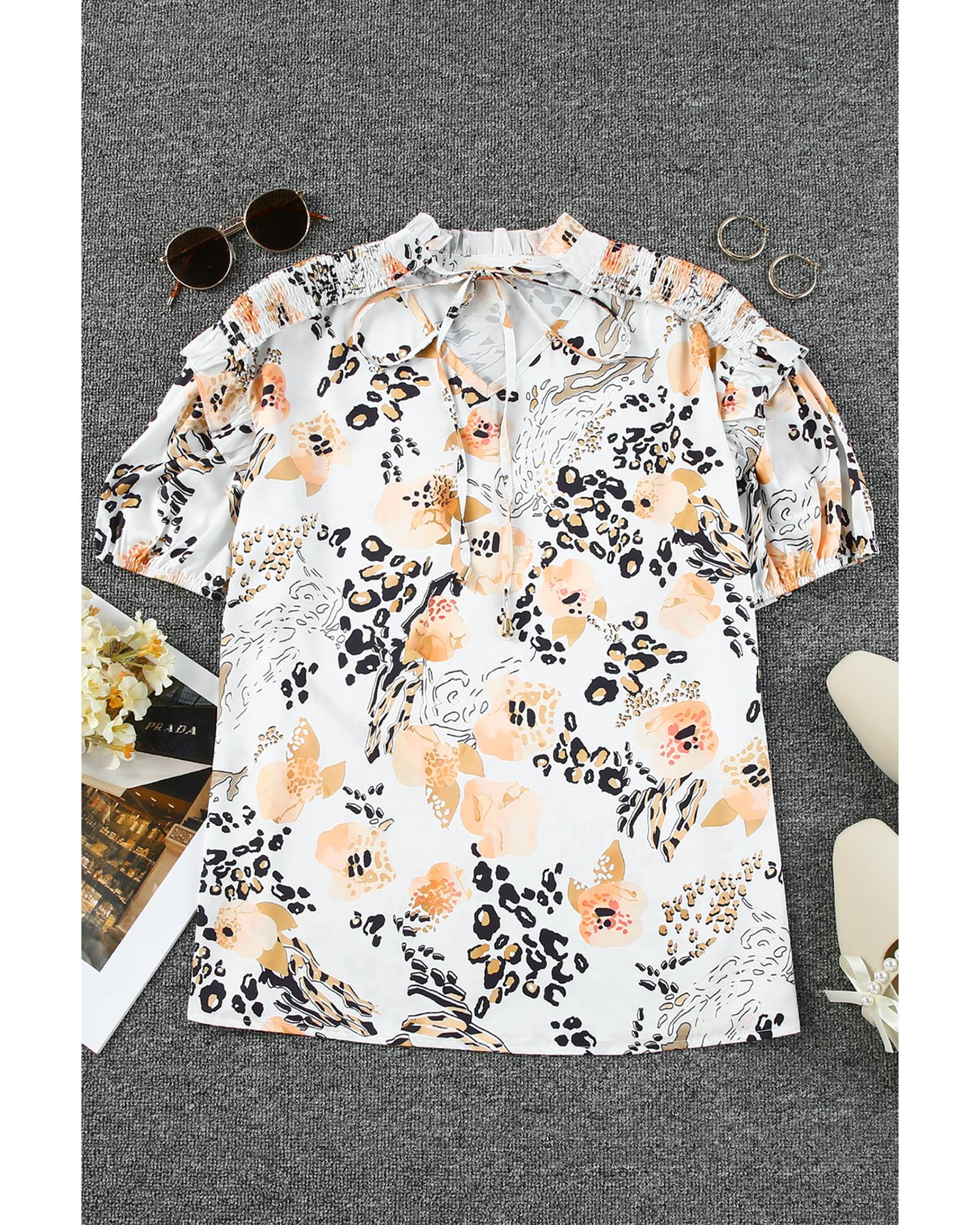 Azura Exchange Leopard Floral Print Puff Sleeve Blouse - S