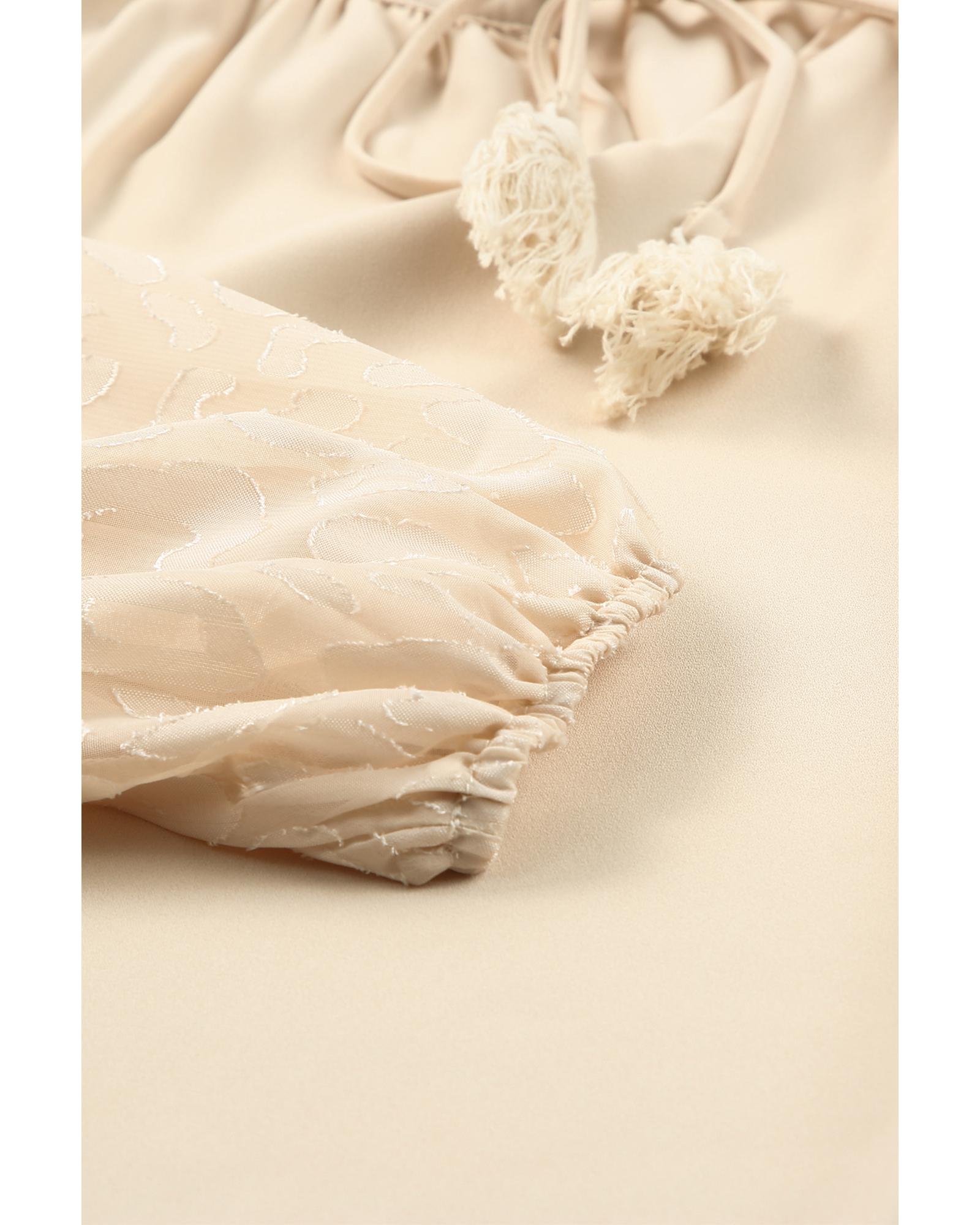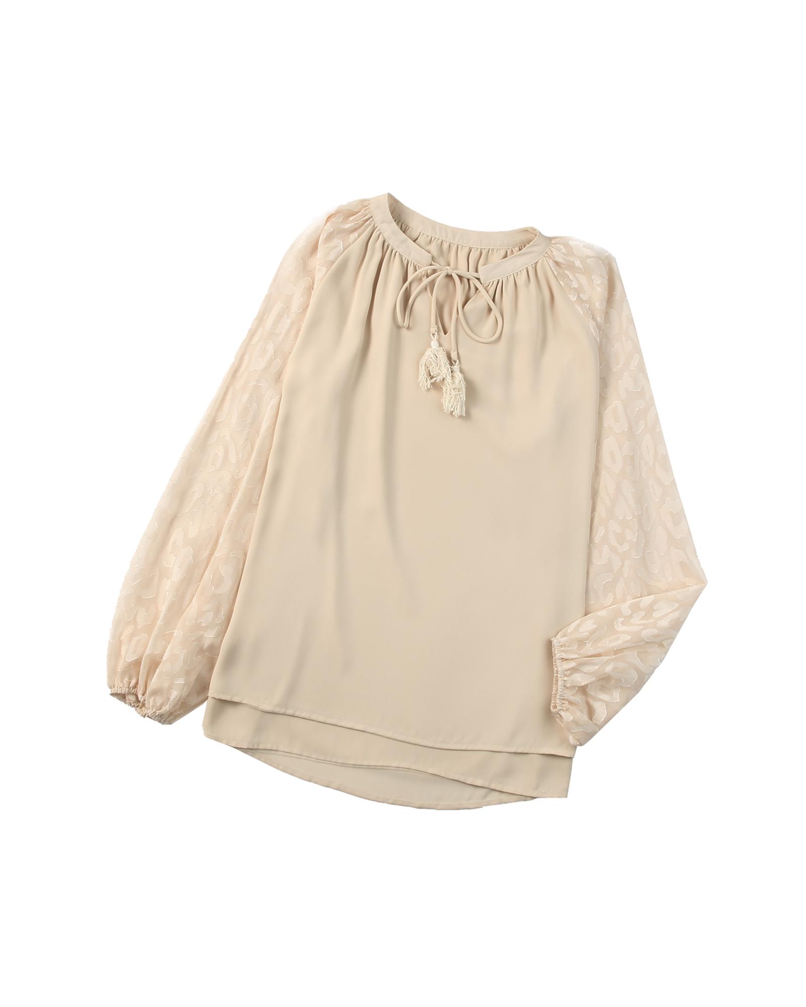 - Beige Leopard Mesh Bubble Sleeve Split Neck Blouse