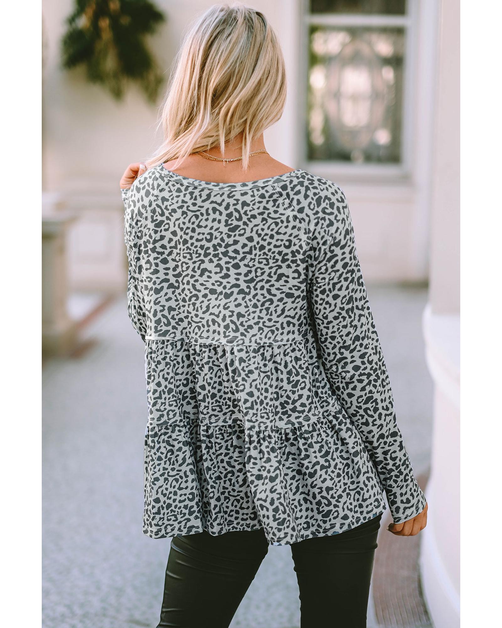 • Stylish and trendy Leopard Print Long Sleeve Ruffled Babydoll Blouse