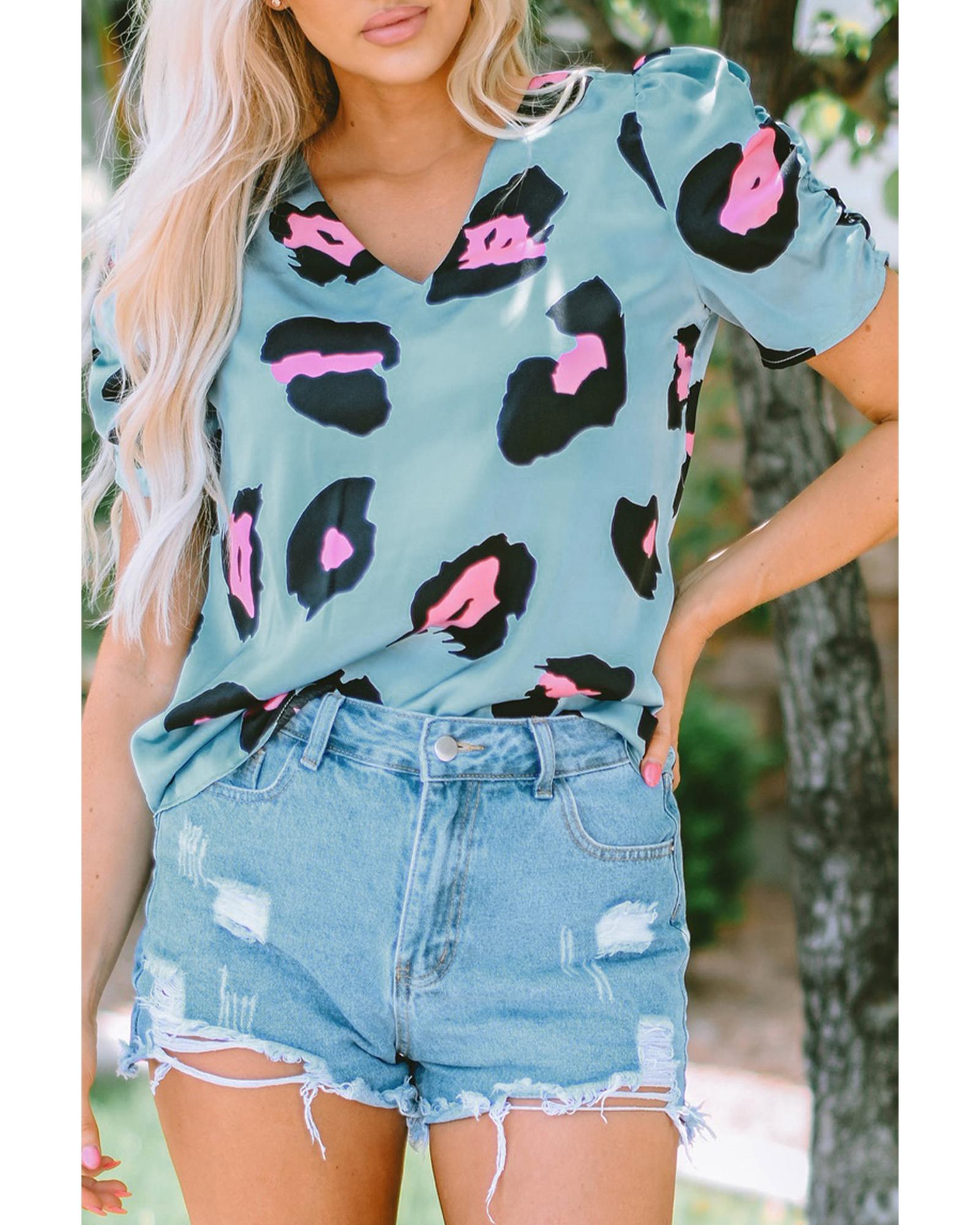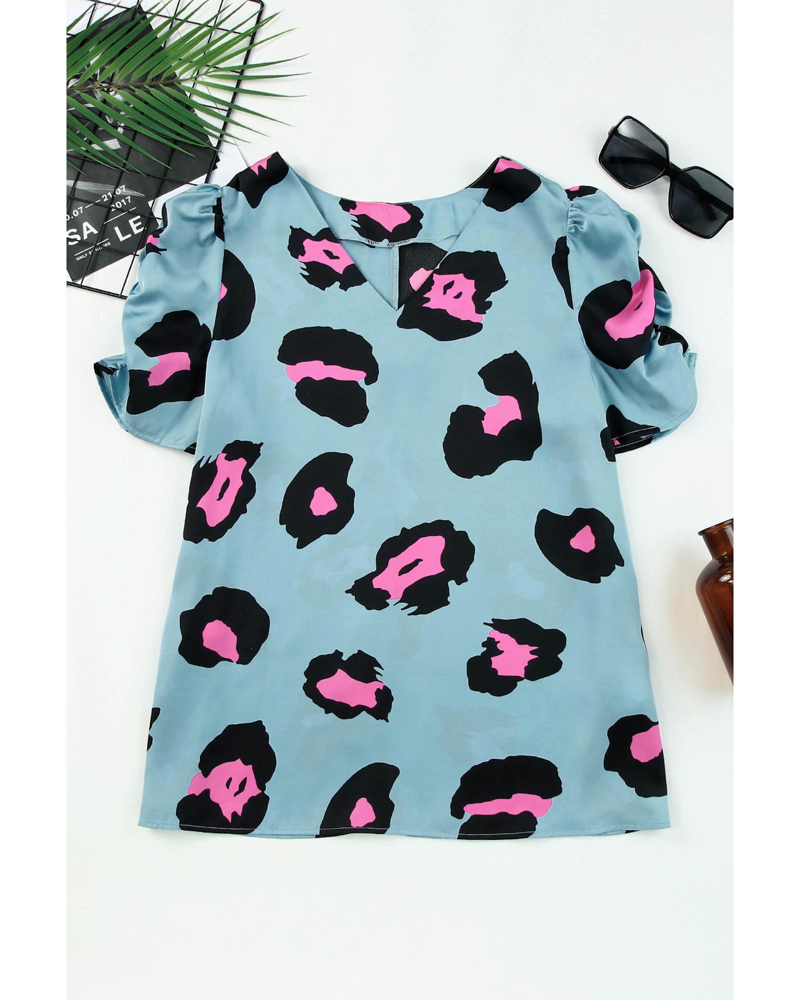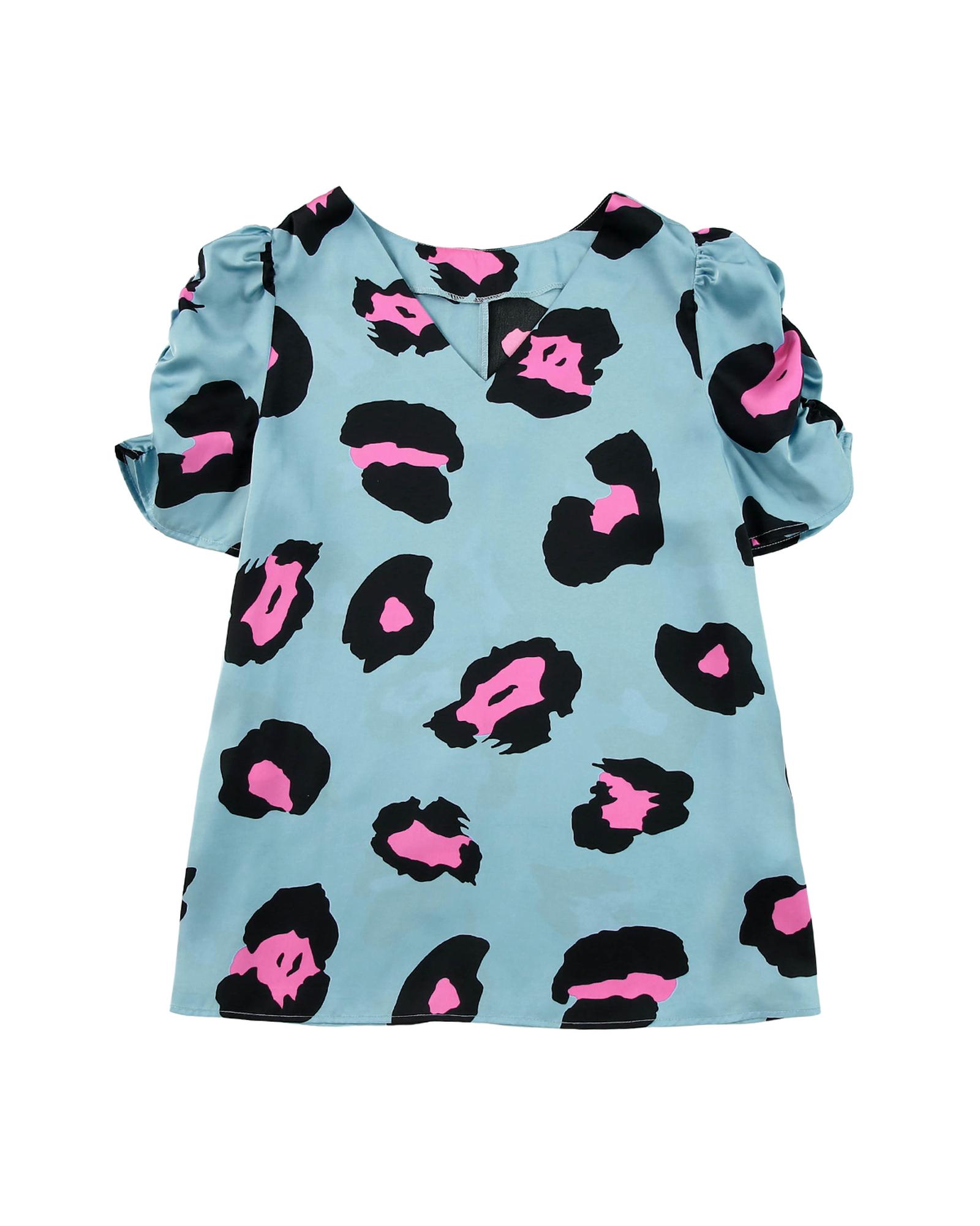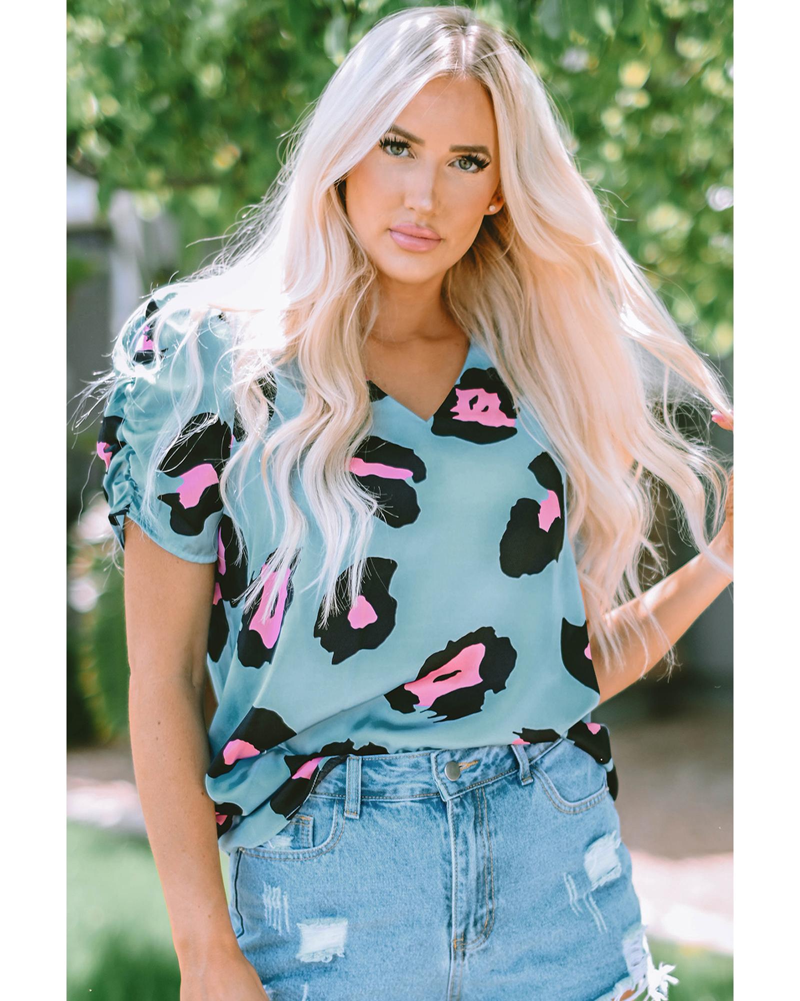 Azura Exchange Leopard Print Ruched Short Sleeve Blouse – M