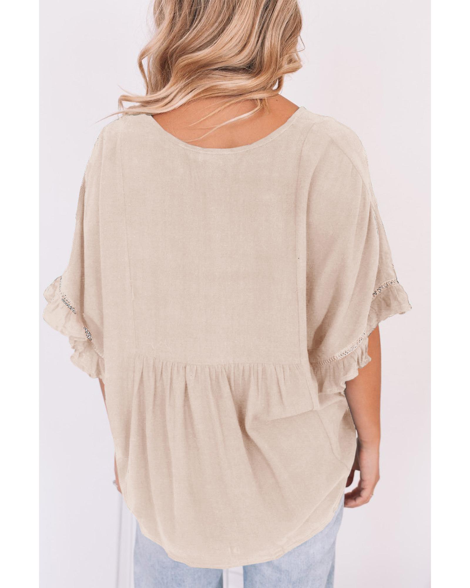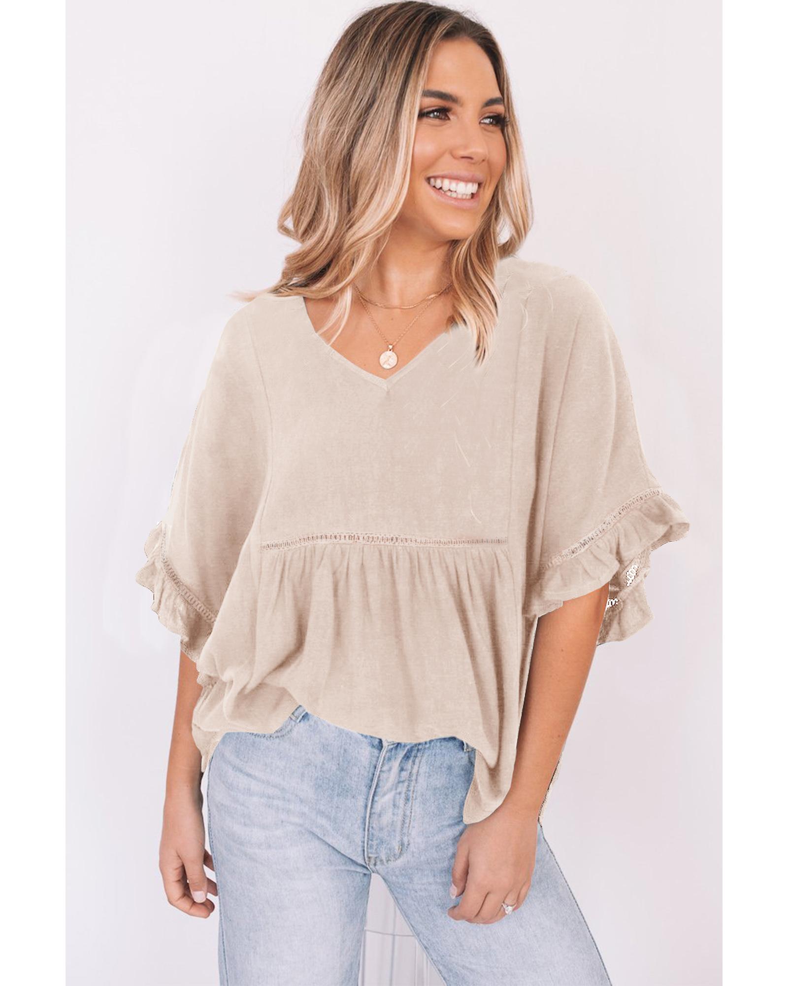 - Stylish and feminine Ruffled Lace Detail Loose V Neck Top