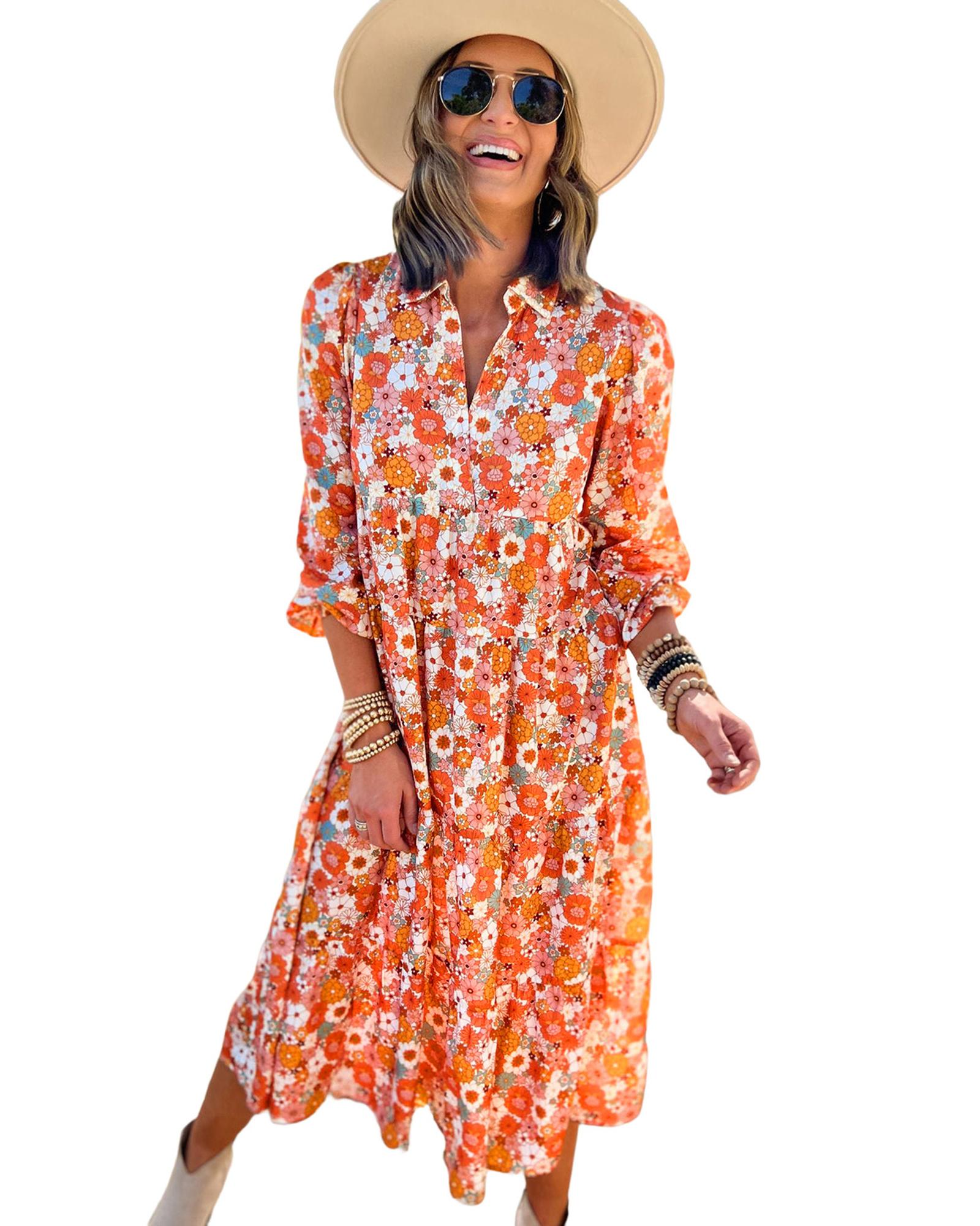 Azura Exchange Multicolor Boho Floral Collared Long Sleeve Ruffled Dress – S