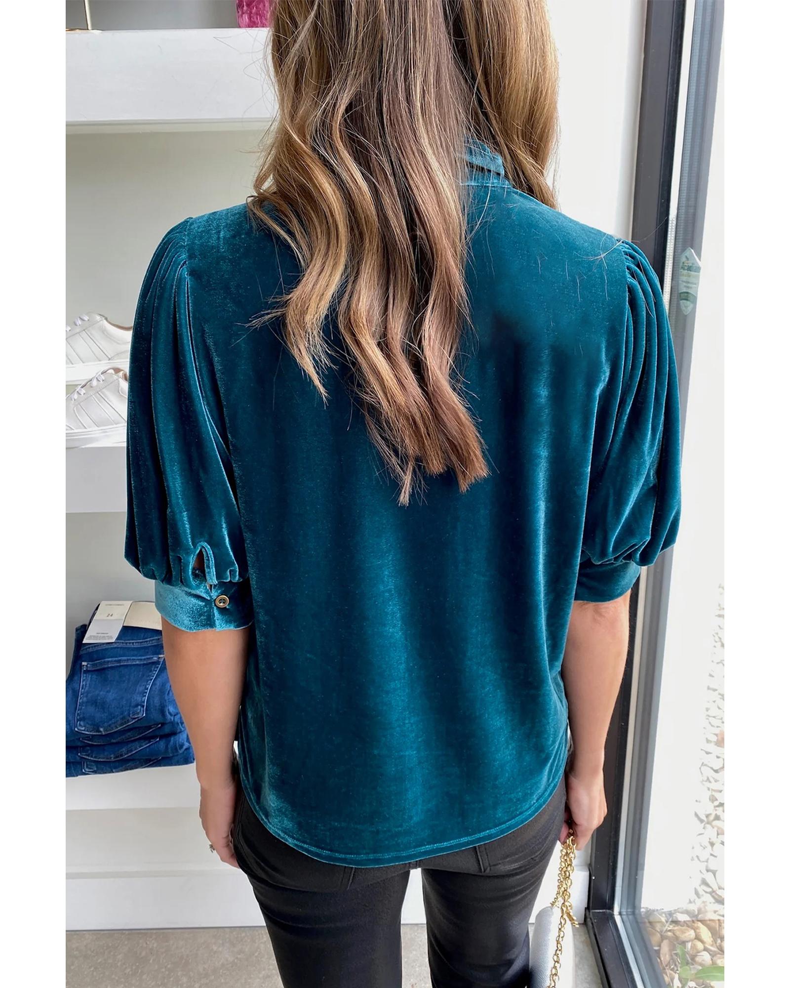 Azura Exchange Peacock Blue Velvet Bow Tie Neck Short Sleeve Top – L