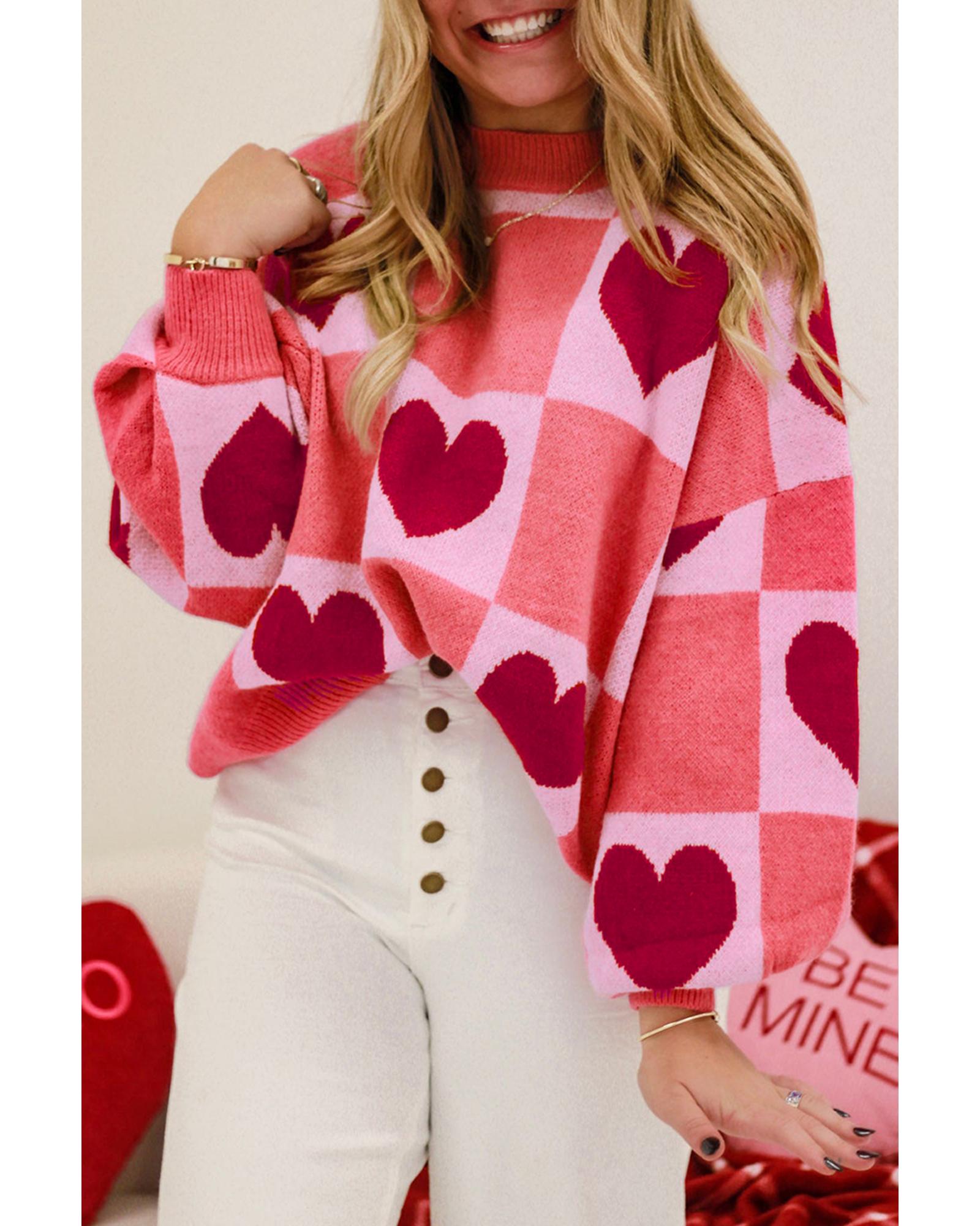 Azura Exchange Pink Plus Size Love Heart Block Mock Neck Lantern Sleeve Valentine Sweater – 1X