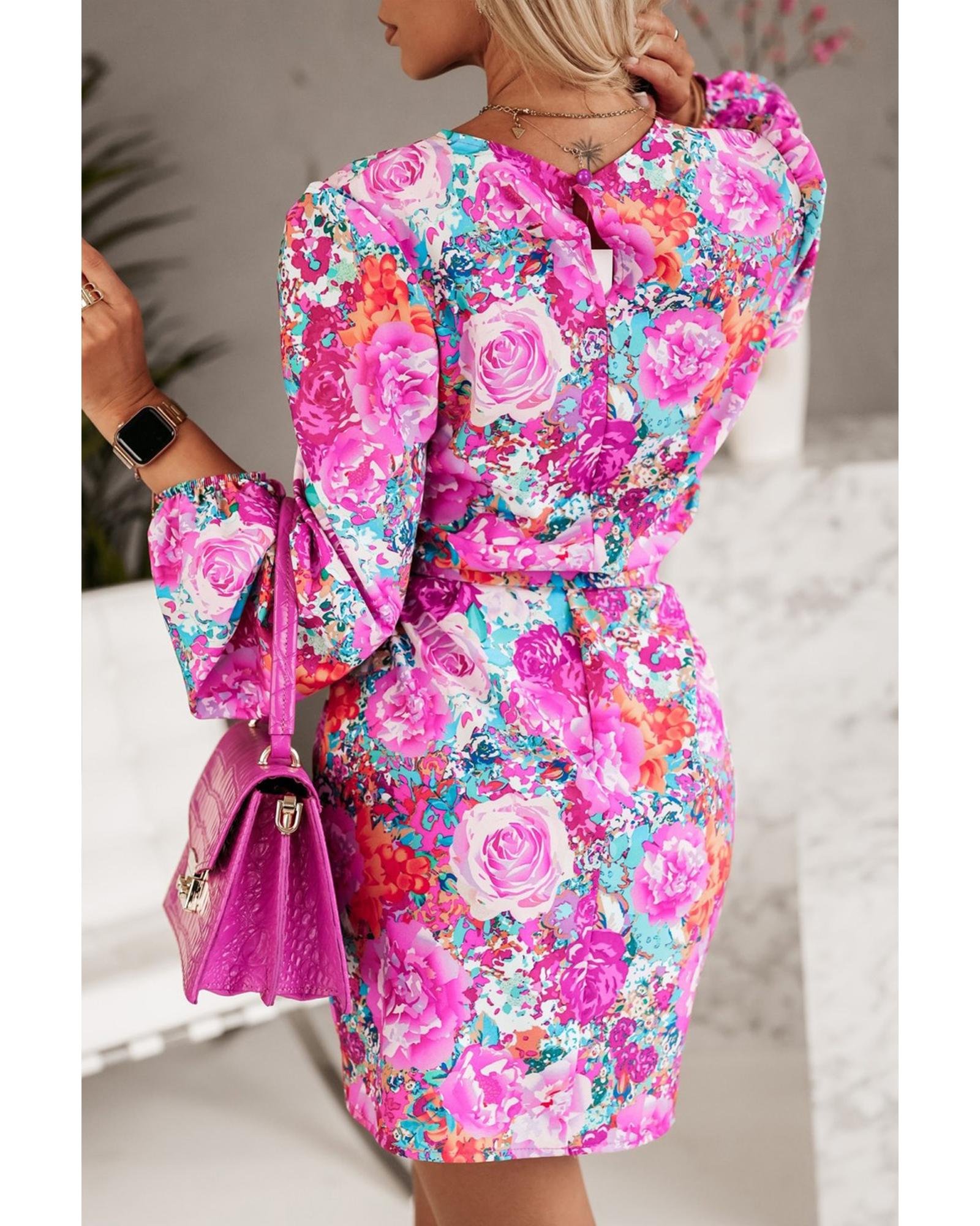 - Purple Floral Keyhole Back Long Sleeve Belted Dress