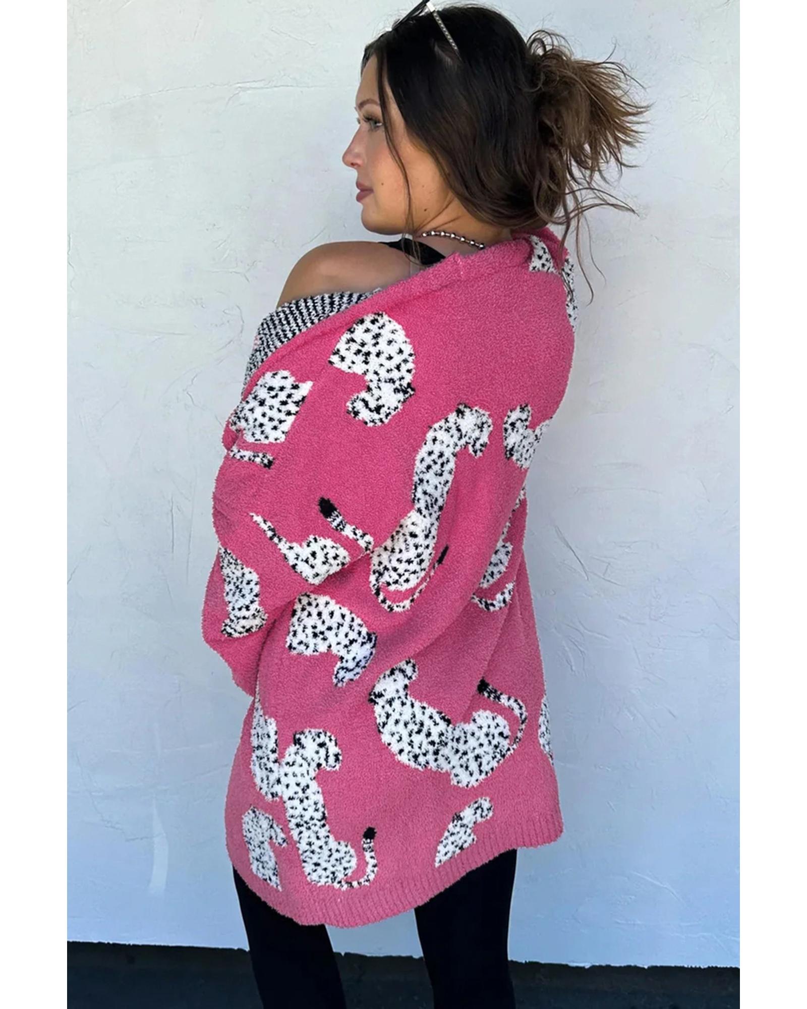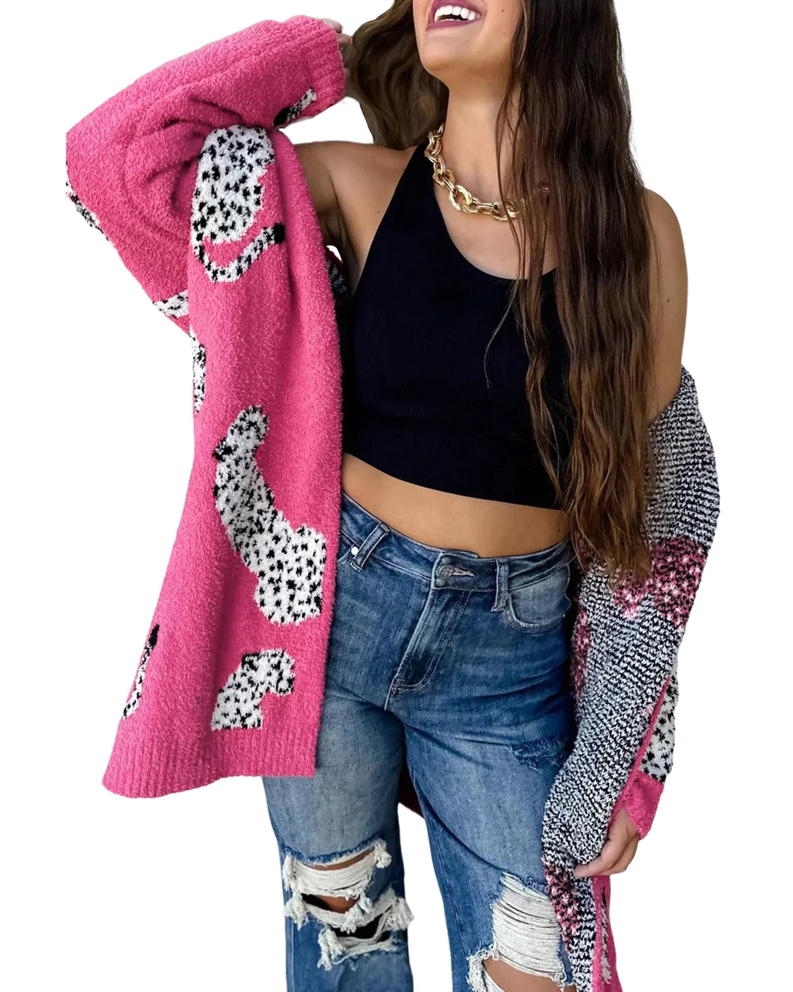 Azura Exchange Rose Red Cheetah Pattern Open Front Knitted Cardigan – M