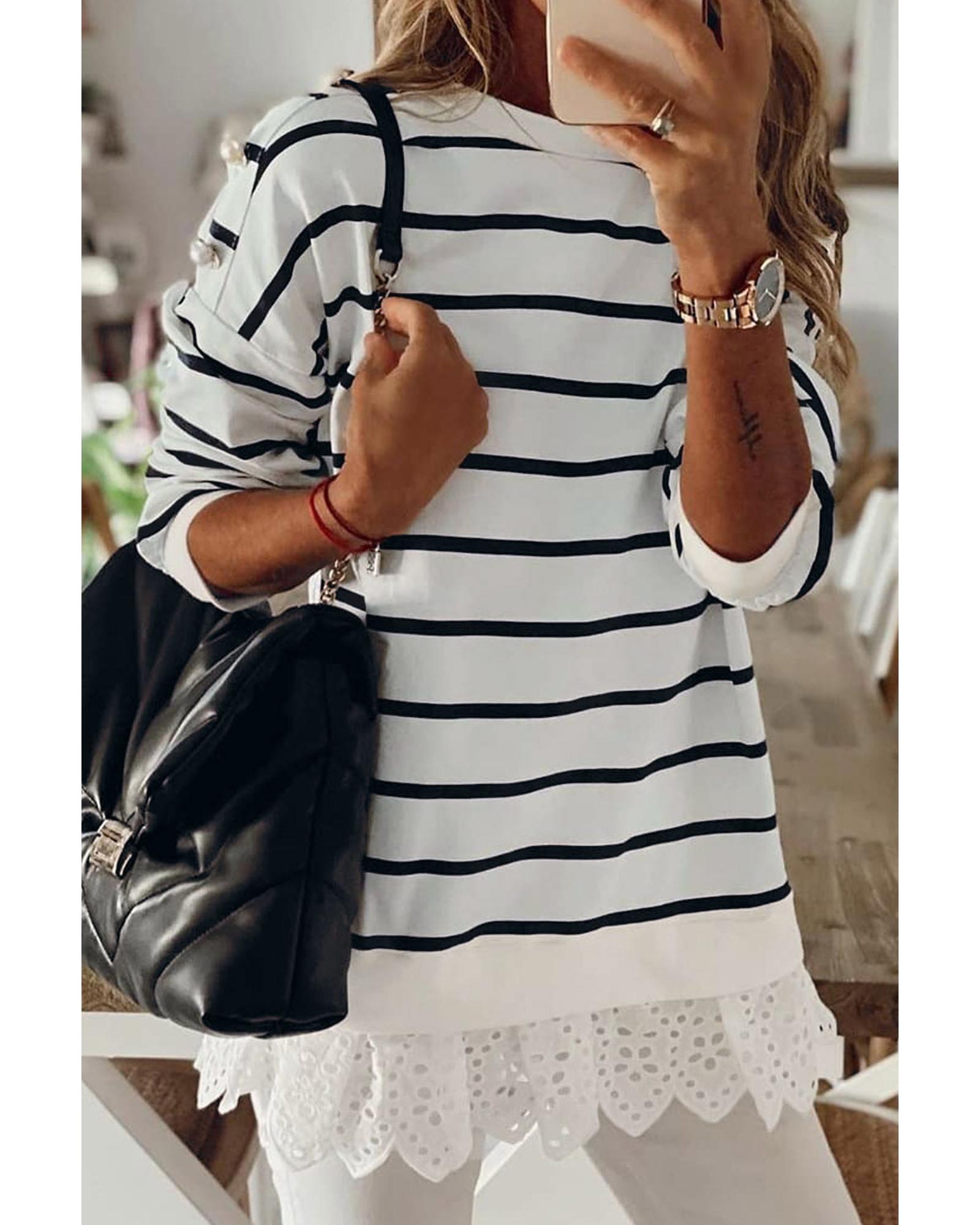 - Versatile and stylish White Striped Button Dropped Shoulder Lace Splicing Top