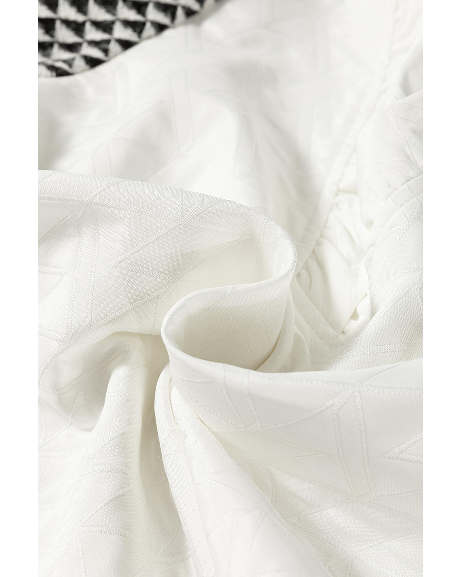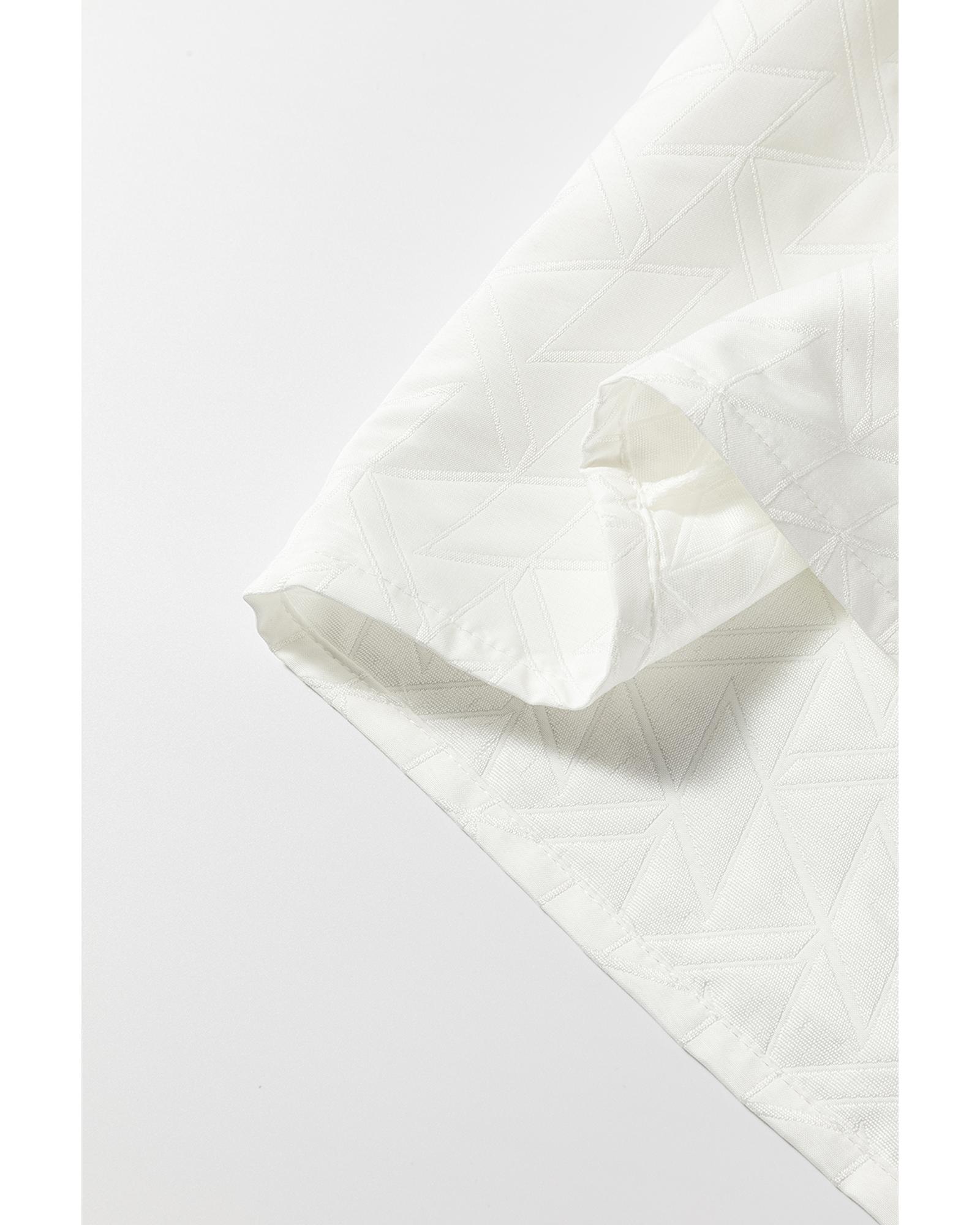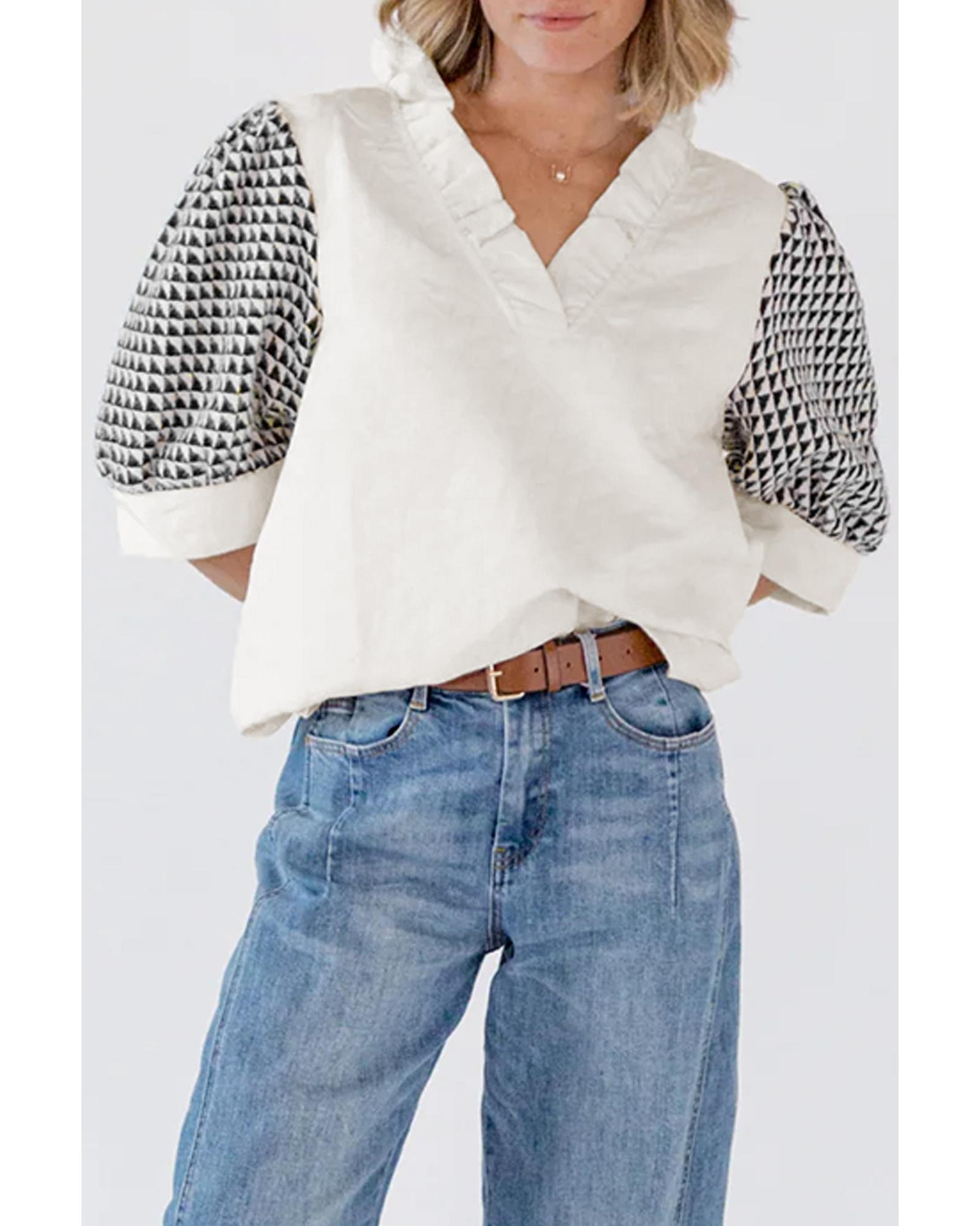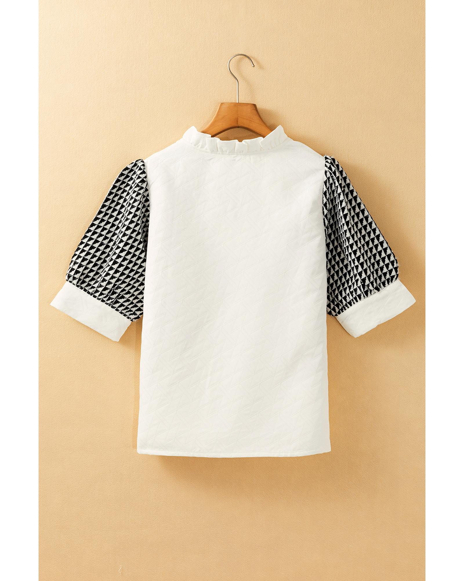 Azura Exchange White Geometric Textured Short Sleeve Frilly V Neck Blouse – L