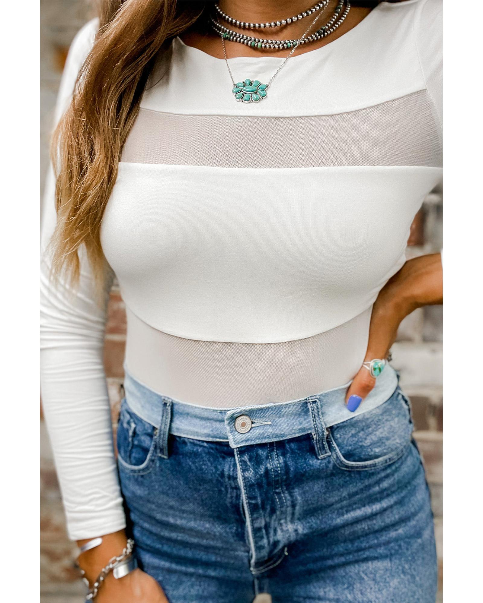Azura Exchange White Mesh Patchwork Long Sleeve Bodysuit – M