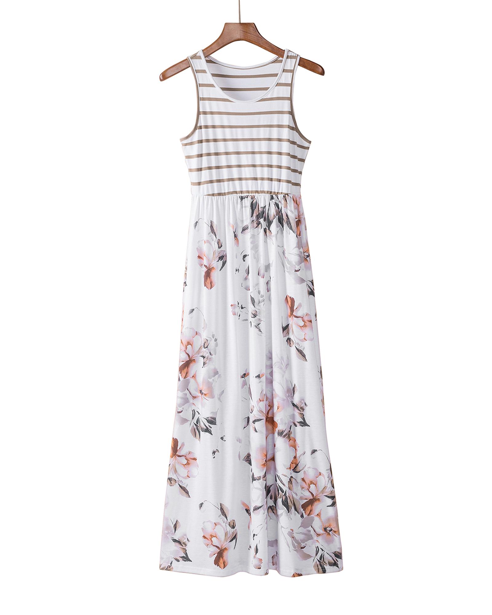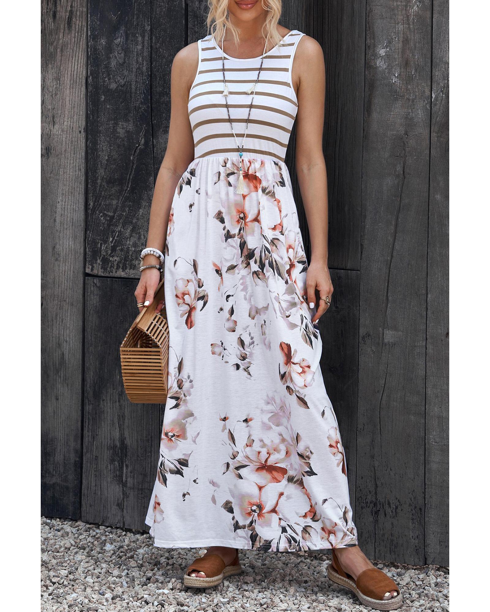 Azura Exchange White Striped Floral Print Sleeveless Maxi Dress with Pocket - S