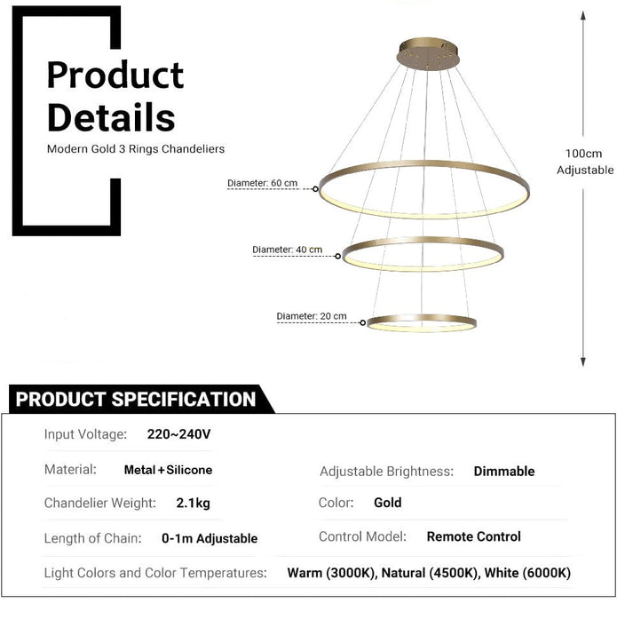 BAMDECOR 18801 Modern LED Chandelier, Dimmable Pendant Light with Remote Control Rings Round Ceiling Lighting Fixture 3 Color Temperatures Contemporary Chandeliers (3 Rings-Gold)