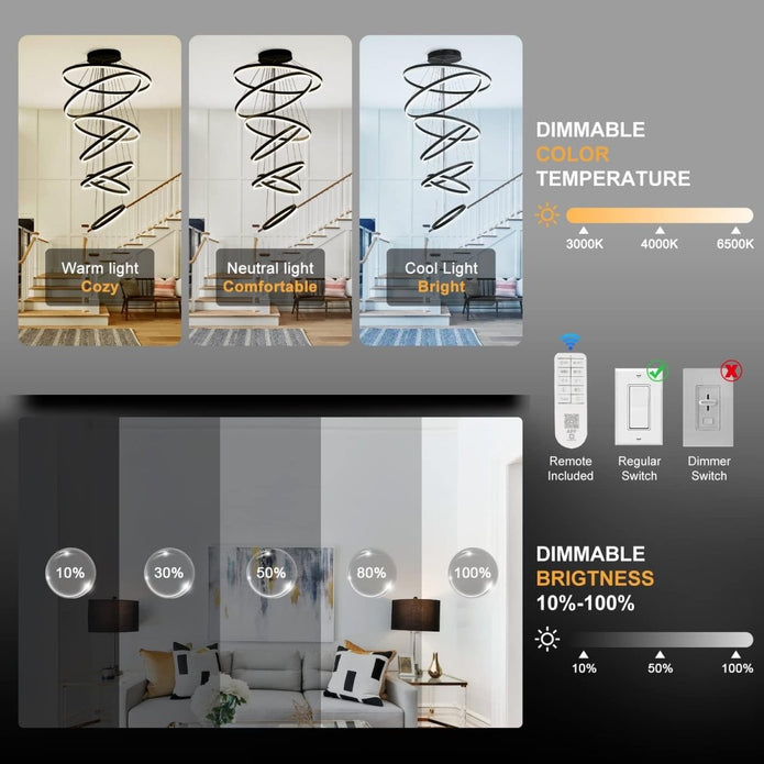 - Stepless Dimmable: This modern chandelier comes with a remote control, which can dim from 10% to 100% and adjust the brightness to suit your needs. You can also adjust three different color temperatures: 3000K warm white light, 4000K neutral white light, or 6000K cool white light. Different color temperatures can meet your different needs. It has a uniform lighting effect, no flickering, no glare, and is more energy efficient.