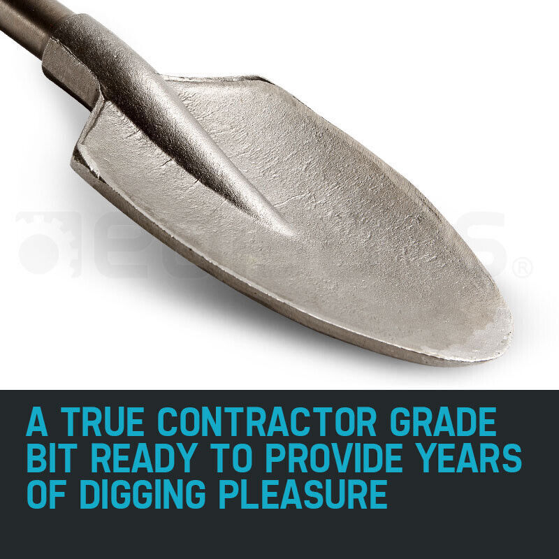 This extra-wide 130mm pointed-tip clay jack hammer bit turns your jackhammer into a powered mega spade! This type of gouge is best suited for hard soil that bends ordinary shovels – time to get your own ultimate jack hammer chisel bit! The full 130mm width and super thick spade base means you only ever need to buy one of these. Resharpen time after time with plenty of meat. A true contractor grade bit ready to provide years of digging pleasure!