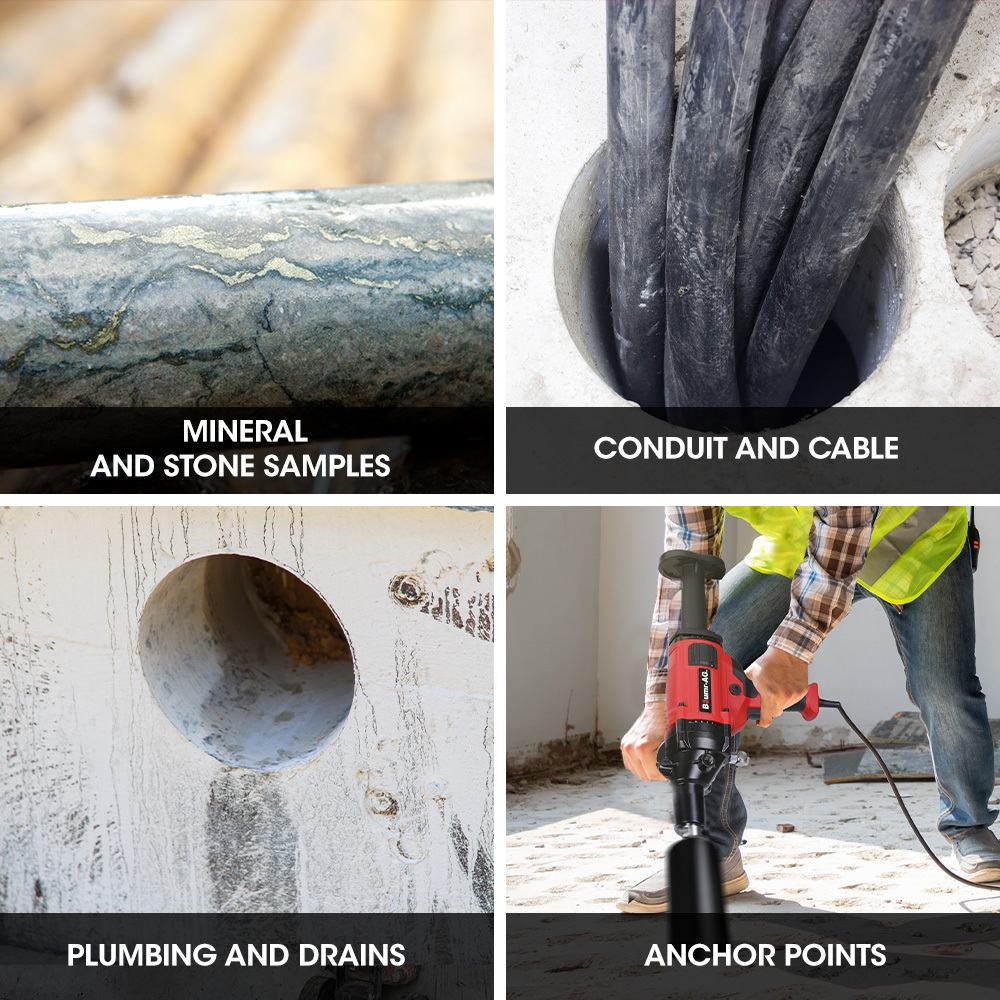 This compact heavy-duty core drill brings superior performance in a handheld core drill. It can handle a 160mm diamond bit, this machine is up for any challenge. It pierces through reinforced concrete, red brick, and even granite, making it the perfect companion for a wide range of construction and repair tasks.