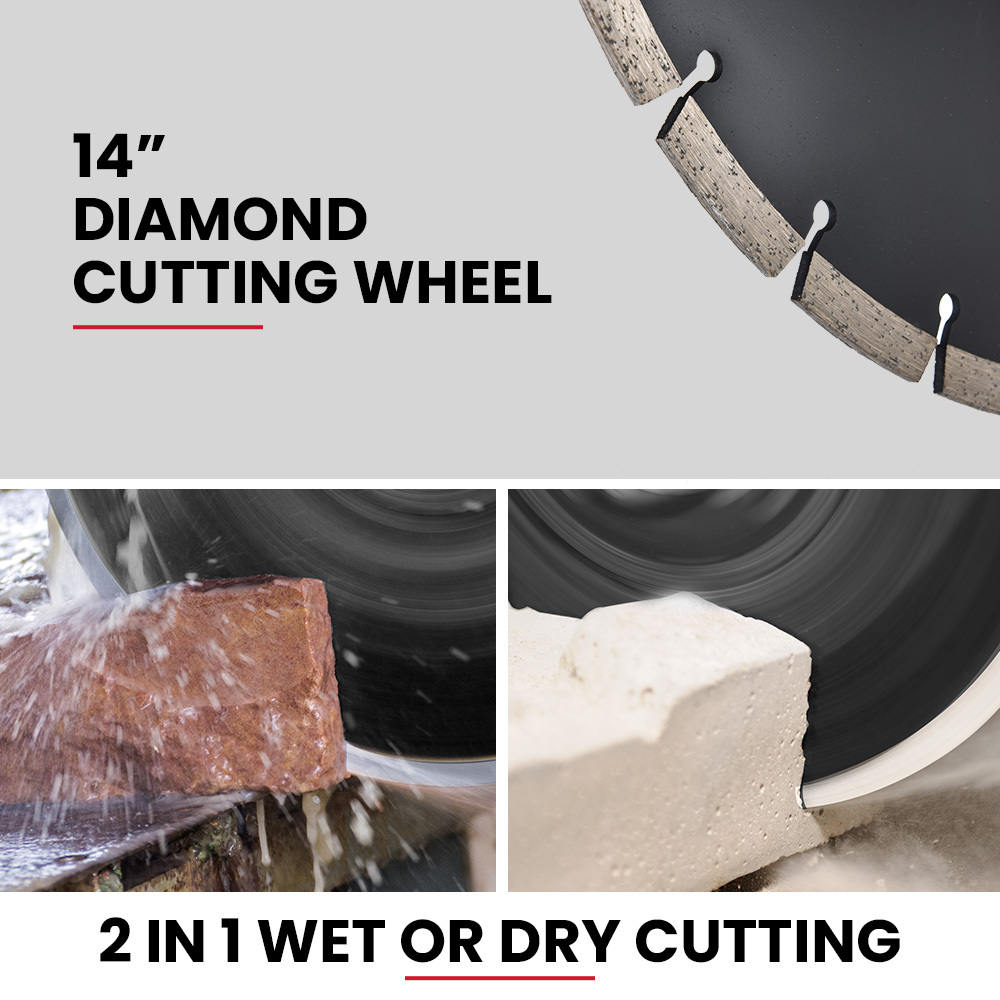 • 350mm diamond blade cuts through concrete, brick, stone, and more