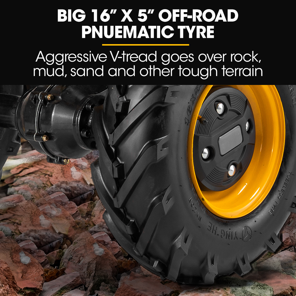 - Front Tyre Size: 16 x 5 Inch Deep V-tread Pneumatic